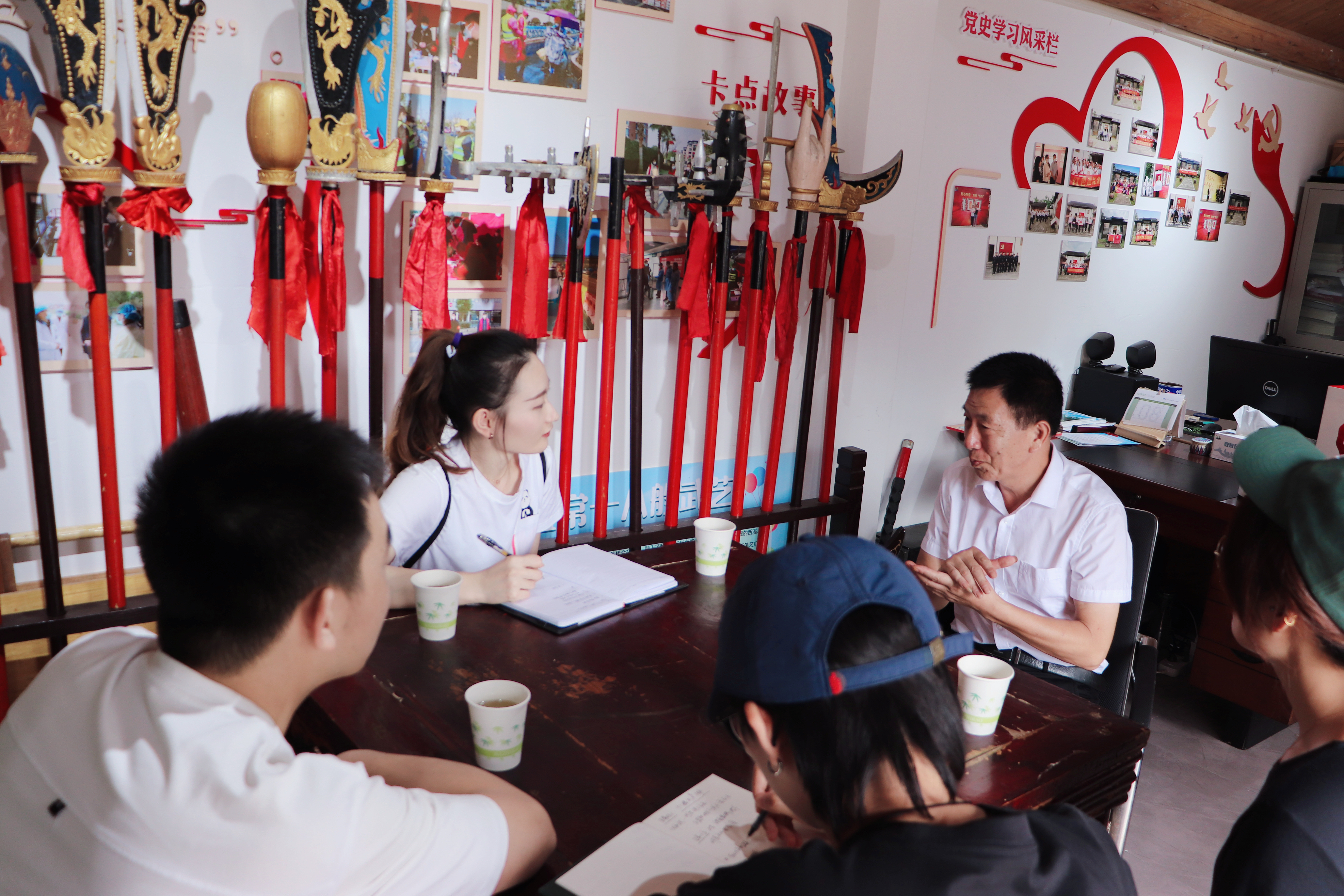 最后,科研团队参观了“五常十八般武艺”陈列馆,在陈列馆内,展出了由明代传承至今的“十八件”兵器,是非常宝贵的遗产,虽然历经年华与磨难,但仍然能感受到那精致的雕工与古人的智慧,不得不令人赞叹。陈列馆内除了展示兵器、传承人谱外,还展示了“五常十八般武艺”开展的各类活动、演出、赛事等,其中包含了一支特殊的队伍——女子“十八般武艺”队,是一道靓丽的风景线。