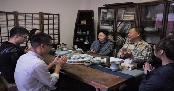 授牌仪式结束后,文化管理系师生一行前往龙泉市古玩市场拜访了毕业后一直从事青瓷行业的校友—07文鉴班校友刘志勇。谢青代表文化管理系向刘志勇表达了母校的问候与关心,并介绍了我系近几年来专业建设与取得的成绩,刘志勇回顾了在校期间的学习与生活,向学弟学妹们分享了自己在从事青瓷相关行业工作中的努力、成就与困惑,阐述了对未来职业的规划和专业愿景,并表达了对母校培养的感谢。