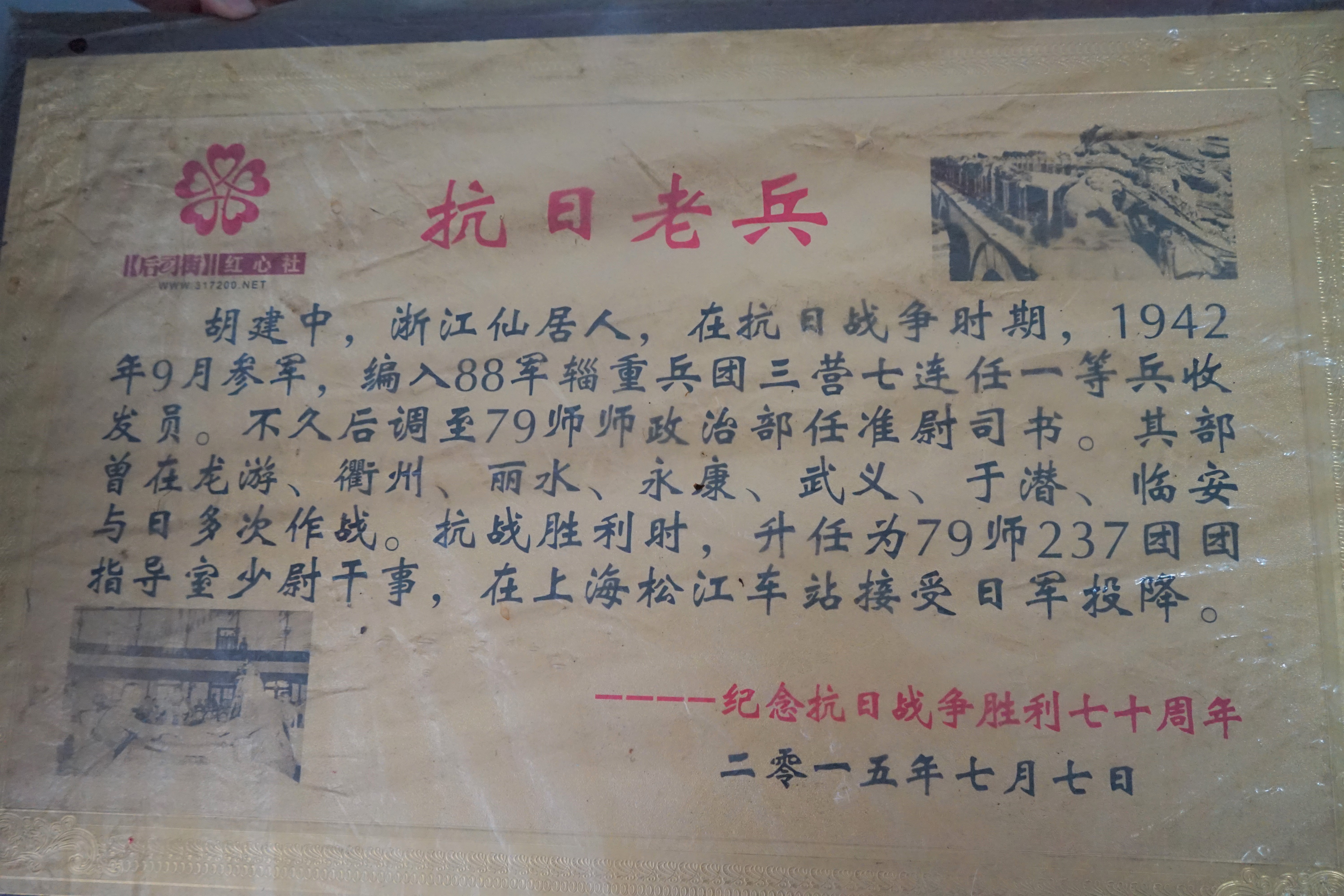 194587日,79师全师在昌化河桥与日军连夜作战,仙居突击一队也一起参加战斗。战斗前一天,胡建中很幸运的遇到2个仙居老乡,其中一位是时任79235团准尉特务长的胡健,但是没想到这一见竟是永别。次日,胡健在与日军作战时肩部不幸中枪,惨死日军刀下。战胜利后,胡老先生就被指派为79237团团指挥室少尉干事,负责监督日军缴械。