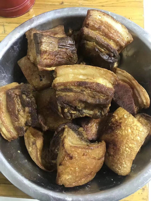 这是为干菜扣肉准备,亲朋好友在家里做客吃饭总会有这一道干菜扣肉。肉炸好了,只需要将肉切成小片,在上面撒上自己家里晒的干菜,加酱油蚝油等调味料蒸就行。主要是因为扣肉本来就是一道比较浓重的菜肴,然后肯定要放在很隆重的节日,春节可以说是非常重要的,还有的话就是扣肉代表的意义就是非常隆重的意思,非常喜庆,所以过年的时候就会出现扣肉来迎接新的一年。