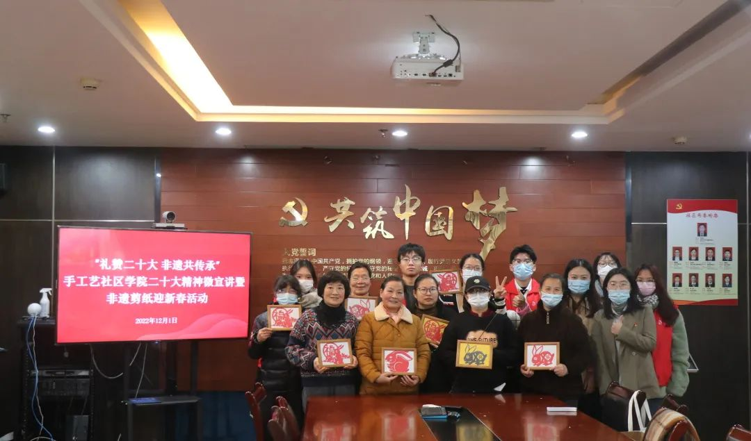 为深入学习宣传贯彻党的二十大精神,助推非遗的传承与发展,12月1日,手工艺师生走进与东信社区联合打造的“手工艺社区学院”,开展“礼赞二十大 非遗共传承”手工艺社区学院二十大精神微宣讲暨非遗剪纸迎新春活动,筑牢居民文化精神根基,宣传非遗文化的独特魅力。