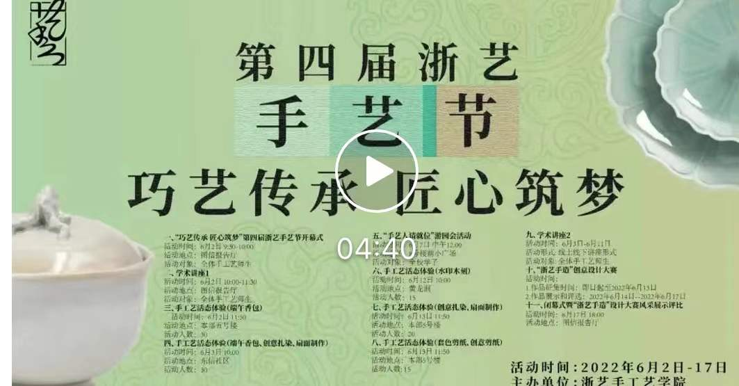 举办“巧艺传承 匠心筑梦”第四届浙艺手艺节,开展手工艺活态体验等11项活动,以“技”会友,以“艺”论道,以“新”诠释,以“巧”衍生。