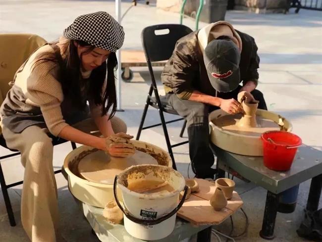 非遗活态展示区与生活美学浙艺课体验区人头攒动,于水印木刻悠长的脉络与繁复的技艺中思考,在扇面上体悟生活中的艺术,从陶艺里传承历经千年的手艺巧思,不少同学上前体验非遗技艺,感受传统手工艺的独特魅力。