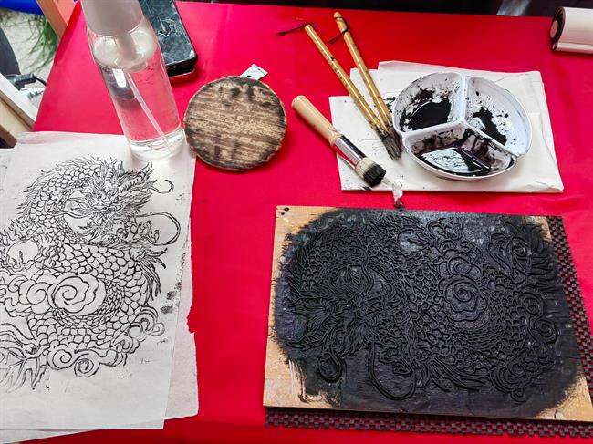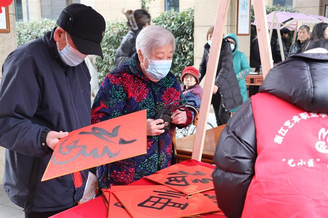 水印木刻体验摊位前,一位长者正认真地印制着自己的作品,每个动作都透露出对传统文化的欣赏和敬意;扎染作品摊位上,一块块布料迎风飘扬,绽放出独特的风采;瓷器作品摊位内,精美的杯、盏、碗引得老人们驻足欣赏;手写福字摊位前,人潮涌动、福字飘香,一笔一划都带着新年的祝福和希望。
