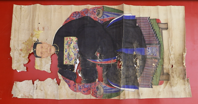 两件需要修复的画像为仙居县溪港乡塘弄村王氏家族所藏清代画像,因年代久远加保存不当,画像出现了霉烂、糟朽、絮化、脆化、掉色、断裂、虫蚀等病害,已不适合长期保存与展示,故需进行紧急修复。画幅装裱形式为传统手工纸镶绫边,均伴有大面积糟朽及缺失,两幅画像天头画赞处均大面积缺失,仅存右边一半,画幅有多处折痕及贯穿伤,因保存不当受潮后大面积滋生霉菌,颜料极易剥落,在前期的保存过程中背后有使用过大面积化工胶水及多层A4纸叠粘,整个修复过程难度较大。