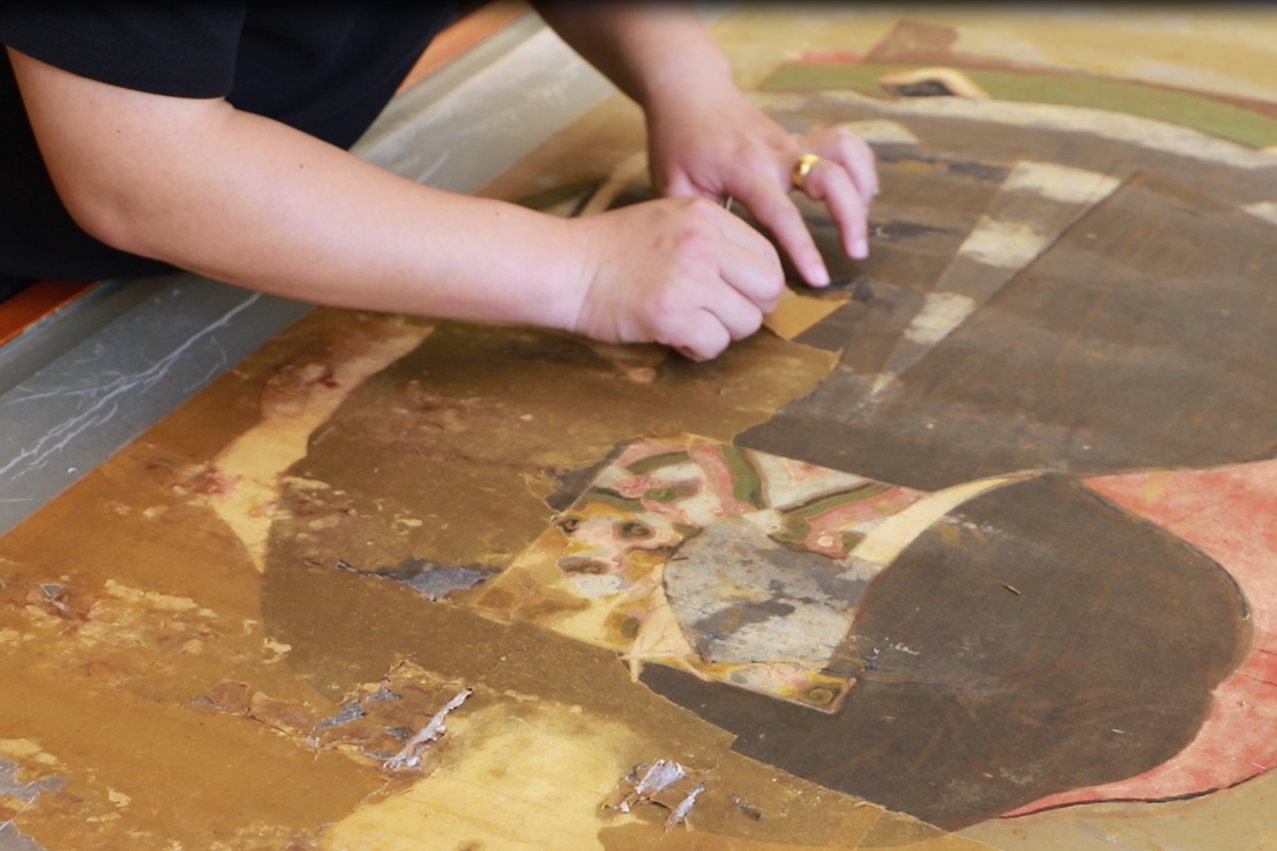 第三,因画幅缺失面积大,糟朽严重,所以在保证胶矾水打到位后需要根据画芯原有颜色将缺失部分填上,根据不同位置颜色进行不断调整,最终达到与画心一致。