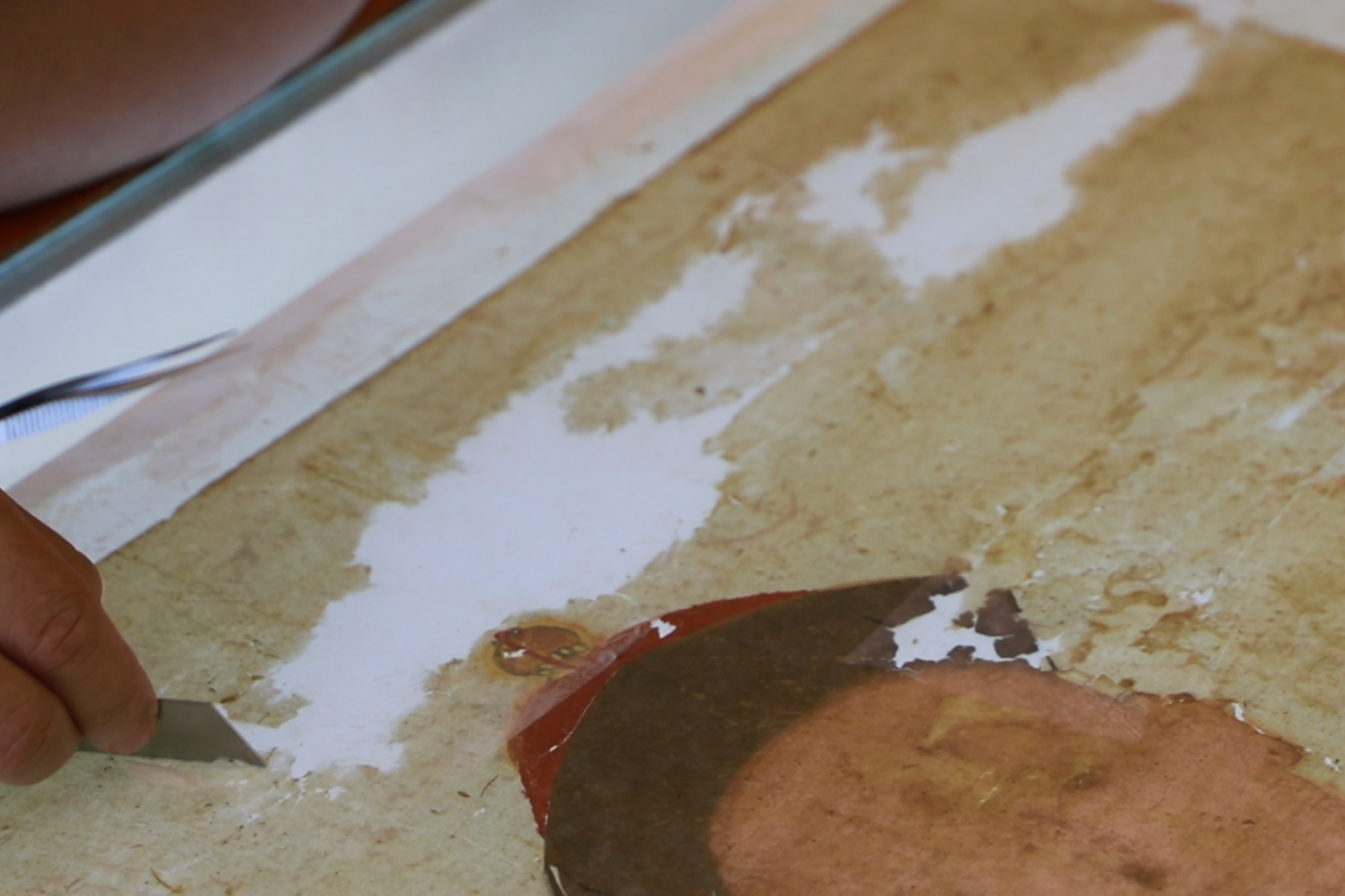 修复过程中修复难度主要在于:第一,拆除画幅背面大面积的A4纸。因其当时使用大面积的化学胶进行粘连,且渗透到前面画心部分,时间较久。若采用传统的闷润后进行拆除,胶水经过试验后难以泡涨,且极易破坏画芯,在拆除的过程中要保证不伤到画芯的前提下,采取干揭,用镊子揭、用刀片刮、用针锥挑,一小块一小块进行拆除。