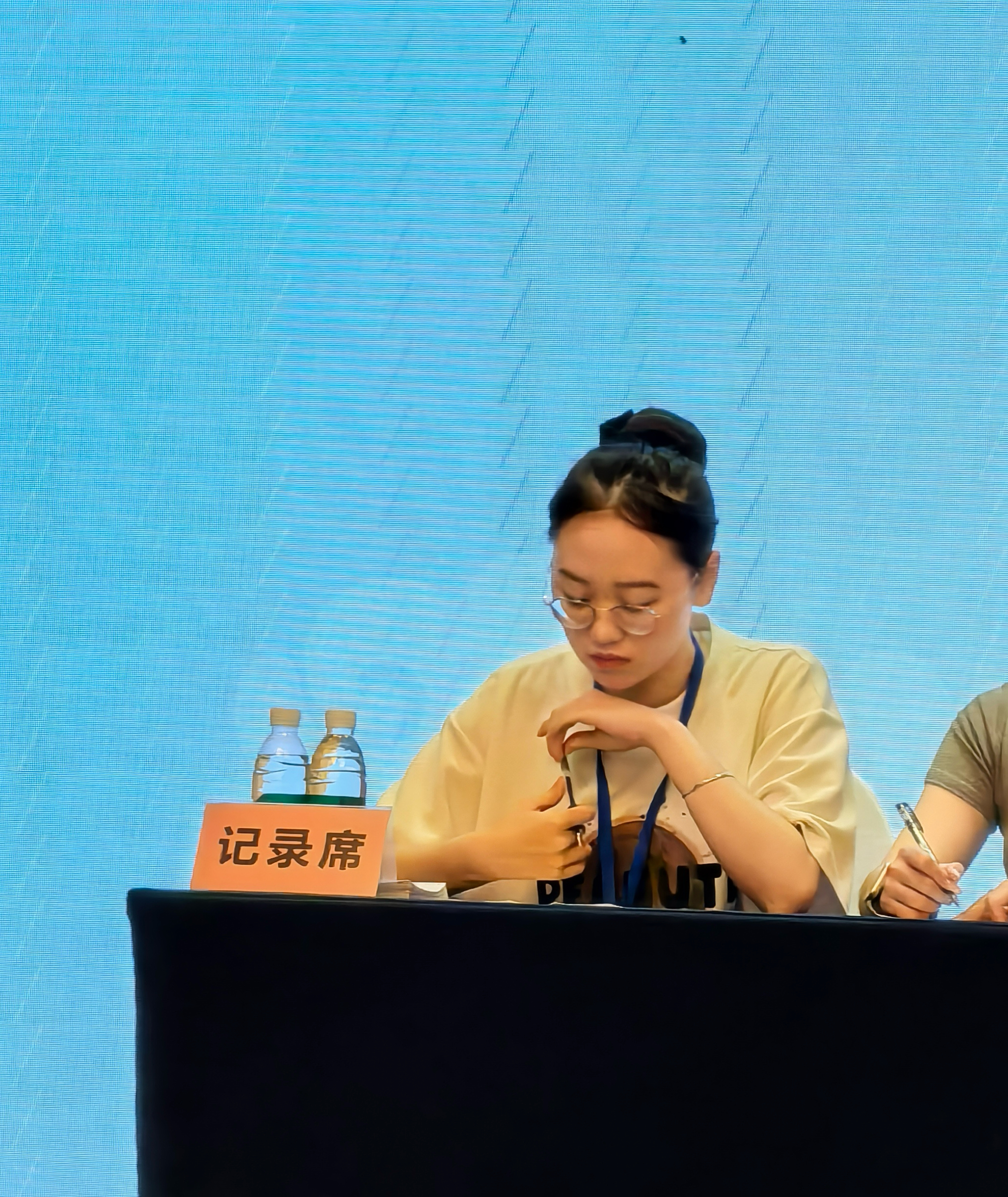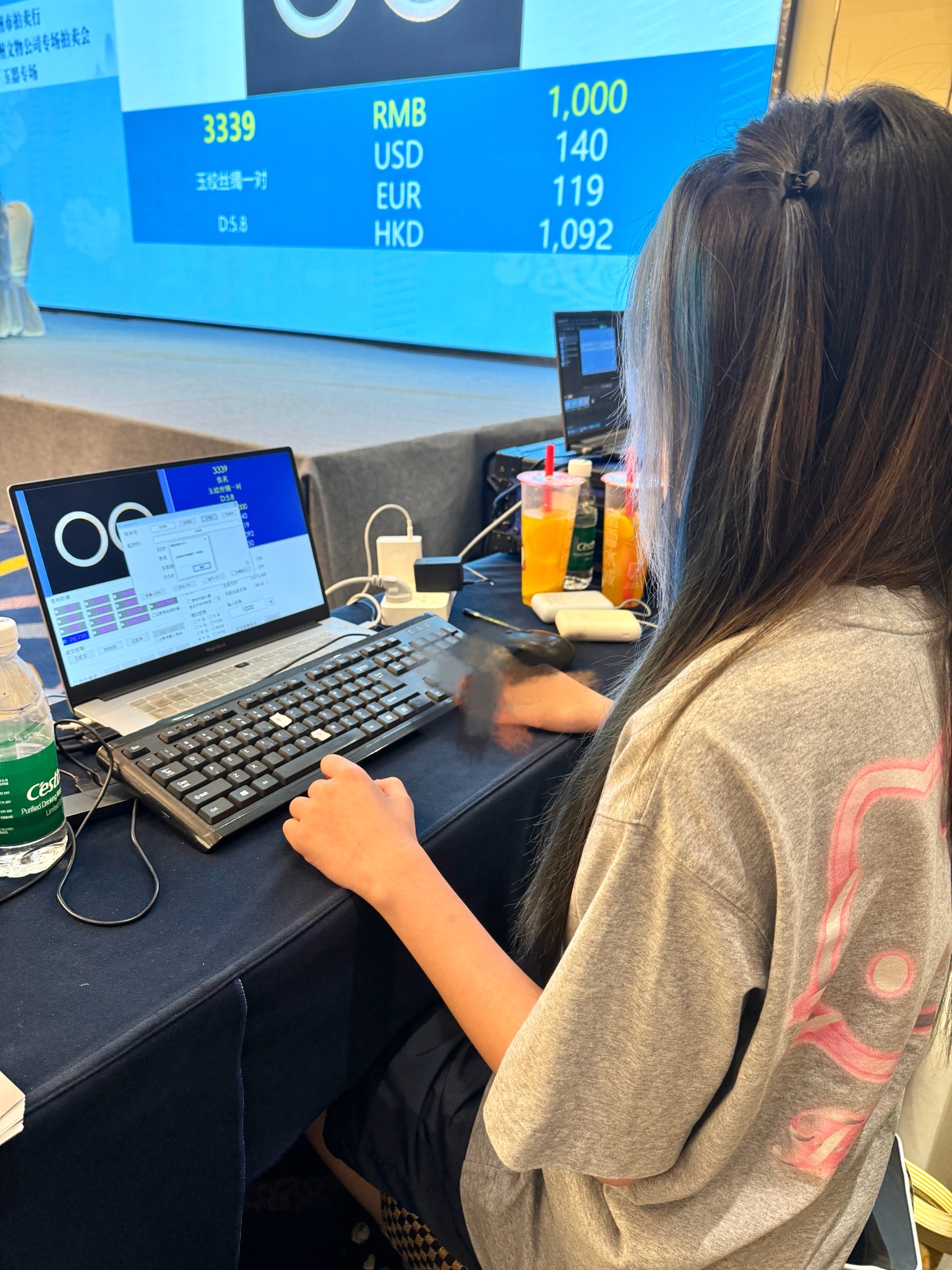 7月25日下午至26日,拍卖阶段正式开启,槌声落处,活动迎来高潮。团队成员各守其岗、全力投入:台前记录员紧盯进程,笔屏同步精准记录拍品品号与成交价,确保数据无误;台下同学守着电脑,随拍卖牌起落、喊价声起伏,快速调整PPT价格动态,实时呈现竞价进度;预展区仍有成员坚守,为客人近距离展示待拍物品、讲解工艺与历史;后台成员则专注文件核对与数据校验,以前后联动保障竞价平稳、成交规范。