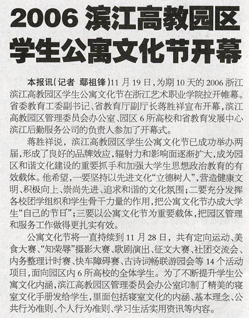 首页 新闻中心 媒体浙艺 教育信息报讯:2006滨江高教园区学生公寓文化节开幕