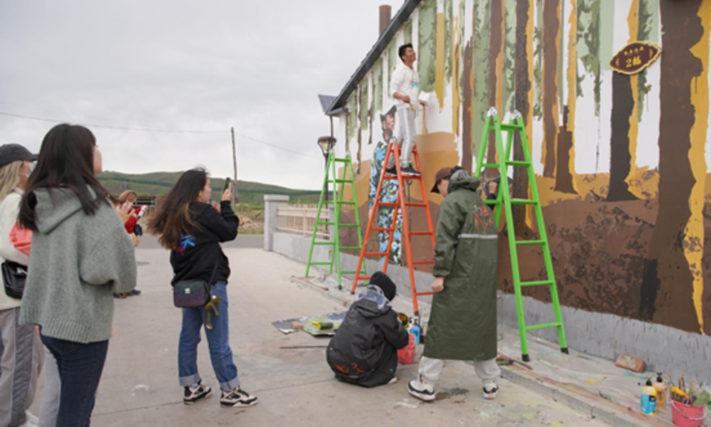 阿尔山市是文化和旅游部定点帮扶县(市)之一,文化和旅游部选派到阿尔山市明水河镇西口村驻村的第一书记郑海勇是本次墙绘与写生活动的主要发起者和组织者。“浙江艺术职业学院师生完成墙绘创作。孩子们用身体遮挡风雨,避免颜料未干被大雨稀释的场景让人动容”,郑海勇在微信朋友圈发布的相关内容发自肺腑、打动人心,是浙艺师生们,也是所有墙绘团队,在西口村辛勤付出的真实写照。