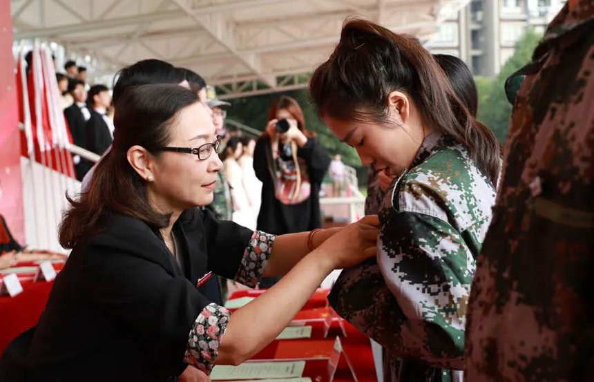 为新生代表佩戴校徽