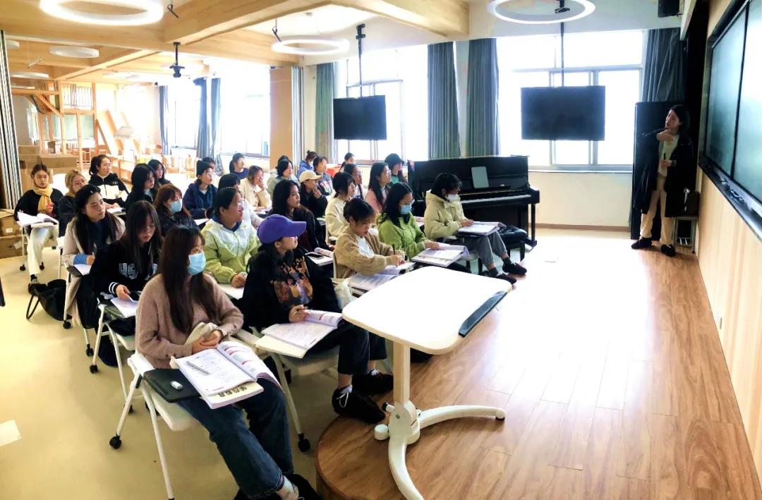 学校还专门建立了模拟幼儿园实训室和远程交互智慧实训室。实训室模拟幼儿园空间,设计了角色扮演区、盥洗室、美术区、益智区、绘本区、游戏区等区域,配有四百多册绘本及幼儿园玩教具,让学生在校学习期间就能感受到幼儿园的工作环境。远程交互智慧教室实训室,除了常规的理论教学,可以与合作幼儿园线上互动,实时观看幼儿园的工作流程,比如保育员怎么配餐,孩子吃完后如何收回餐具等,还可以线上提问,及时解决学习上的困惑。