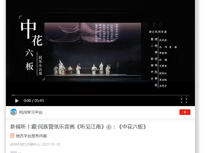 《中花六板》为江南丝竹八大曲之一,乐曲走势蜿蜒起伏,旋律清新流畅、细腻柔美,富有浓郁的江南韵味。