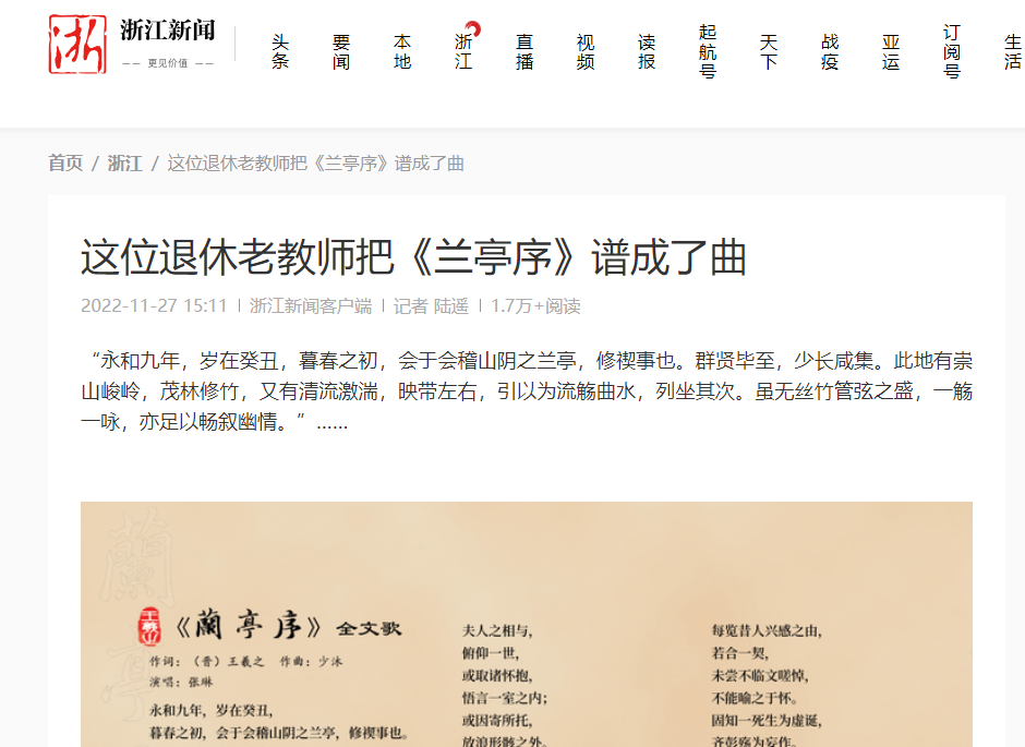 浙江新闻:这位退休老教师把《兰亭序》谱成了曲