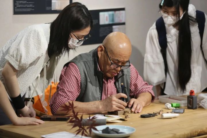 王师傅一双布满老茧的手稳稳当当地篆刻着厘米小的木块,呈现出生动的线条和精致的纹理,一雕一刻间尽显传统技艺的魅力,吸引了同学们驻足学习,向文物专业的学子们敞开了木活字印刷这一中国古老技术的大门。
