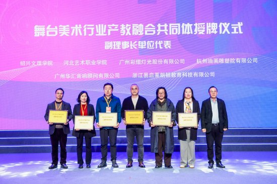 与会领导与嘉宾共同按下启动键,舞台美术行业产教融合共同体正式成立。大会还为共同体理事长单位、副理事长单位代表授牌。