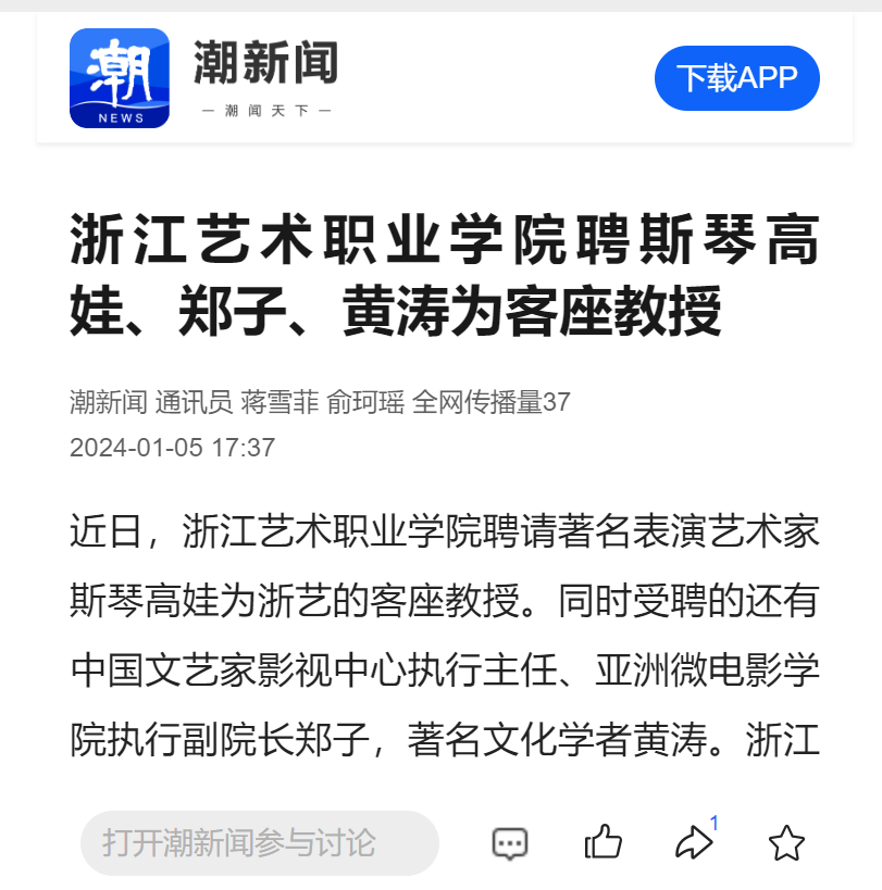潮新闻:浙江艺术职业学院聘斯琴高娃、郑子、黄涛为客座教授