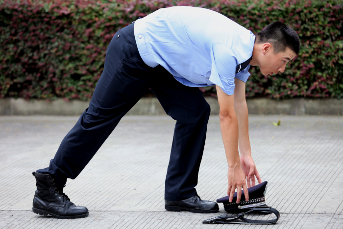 全体休息的哨音吹响了,可是休息之前还有一件事情要做好呢。看教官的标准姿势——“脱帽,放下;坐……”