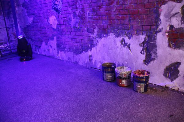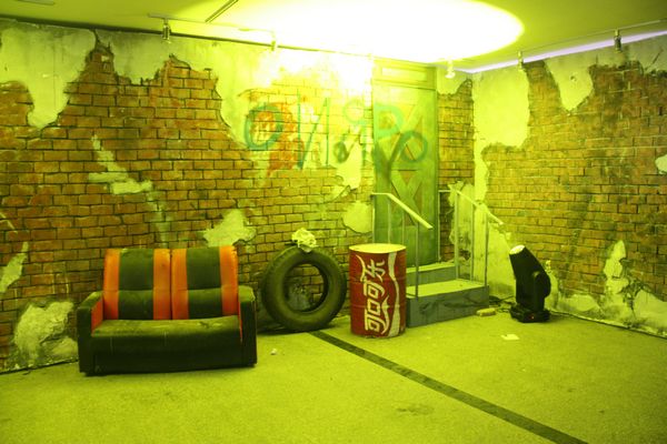 这次毕业展览依托4号楼大厅为空间,创造出一个复古中透着七八十年代叛逆朋克气息的世界。离四号楼正门50米开外的地方,老远就能望见一个火红的立方体,上面刻有四个黑色木雕大字——舞美出品。展区入口呈凹形,犹如哆啦A梦的时光隧道,带你进入一个现实穿越梦幻的舞台。这不是好莱坞大片现场,也不是街舞社团,更不是3D鬼屋,但这里的每一个细节无不体现出奇幻与现实的巧妙结合。场景内部设有3个彩色散光灯,颜色依次是:红、蓝、黄、橙、紫、白。红色给人一种火焰燃烧之感,绿色则透着一种温暖奇幻之感,而白色又带来回归现实的感觉。墙上布满了涂鸦,还有左测废弃的轮胎,旧沙发,可口可乐的汽油桶。楼梯和门的设计也成为展出的一道风景线,往右边走去你会看见一个类似于观望台一样的梯子,当灯光匀速转动并更换时,会在墙上形成不同的投影。