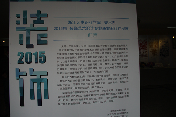 又是一年毕业季到来,承载设计梦想于希望的年青人在浙艺院放飞梦想。12月3日,浙江艺术职业学院美术系2015届装饰艺术设计专业毕业展在4号楼大厅拉开帷幕。本次展览由12装饰班、12广告设计与制作1班2班共84位同学联合推出,分为“装饰艺术设计”作品展示和“平面视觉设计”作品展示两部分,以首饰、家具、软装、书籍、包装、海报等综合设计为推广展示。