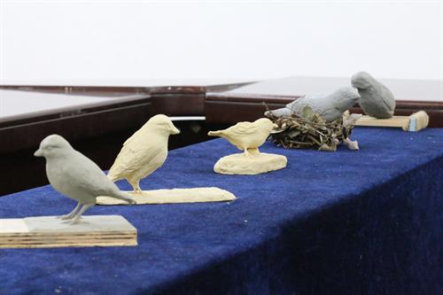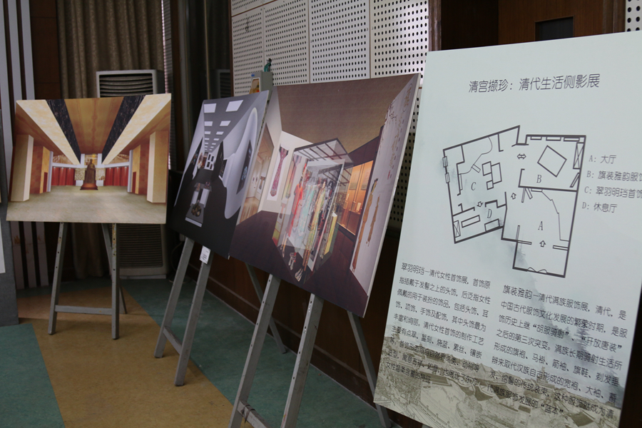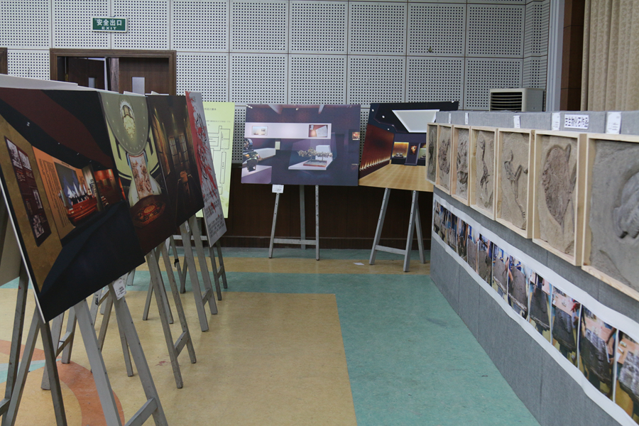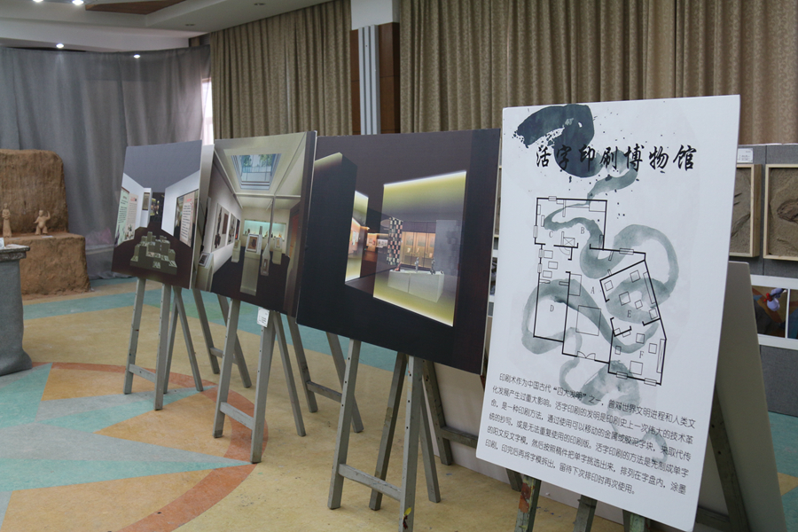展览现场历史文化气息浓厚,充满了严谨肃穆的氛围,展品以博物馆实景还原和仿古实物为主,分成“博物馆设计作品展”、“墨彩无华”(博物馆绘画作品展)和“梦想钱塘”(六和塔微景观制作展)三个主题,分别陈列了博物馆设计图、古生物化石、仿古陶俑、国画、插画、微景观等作品。