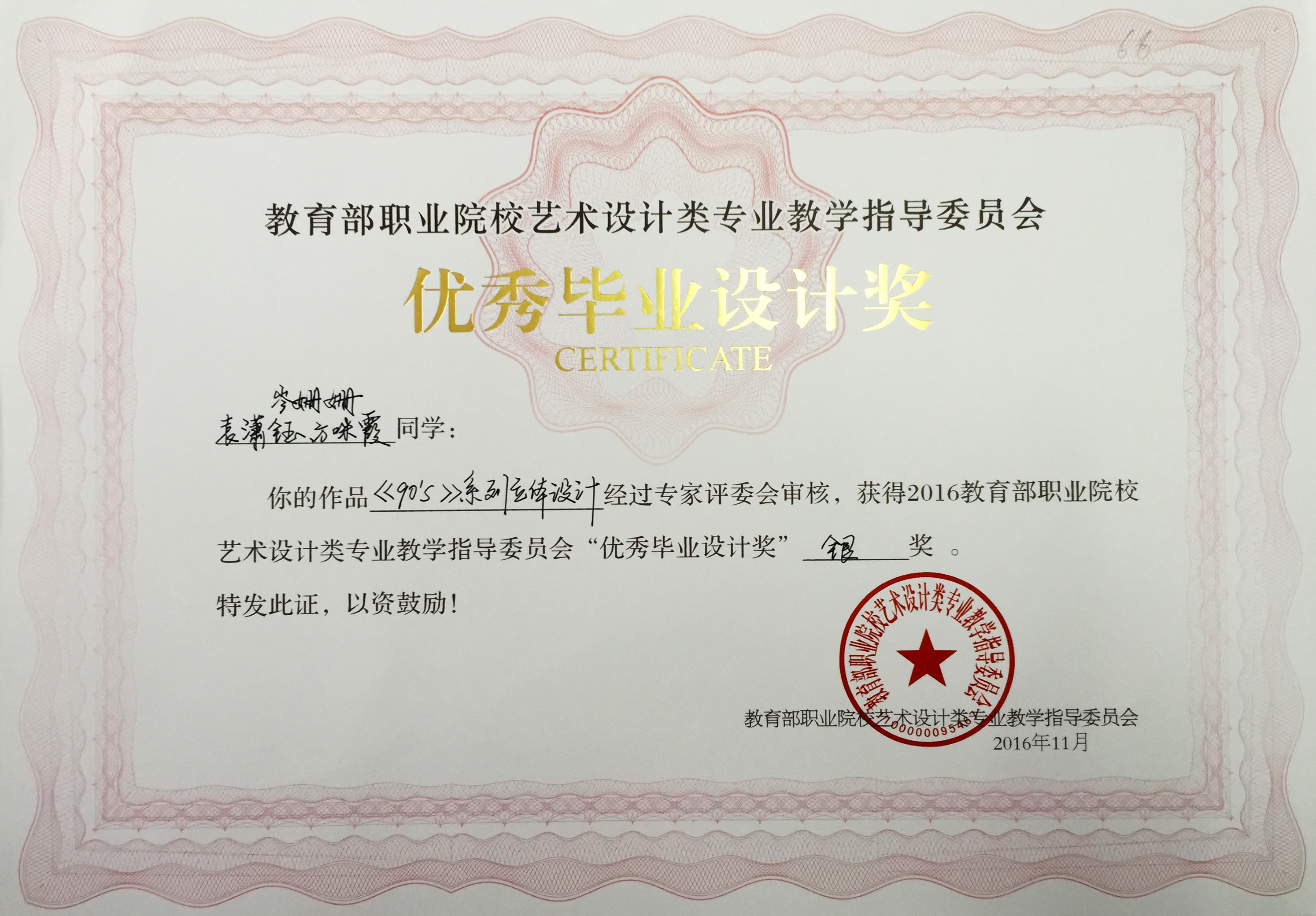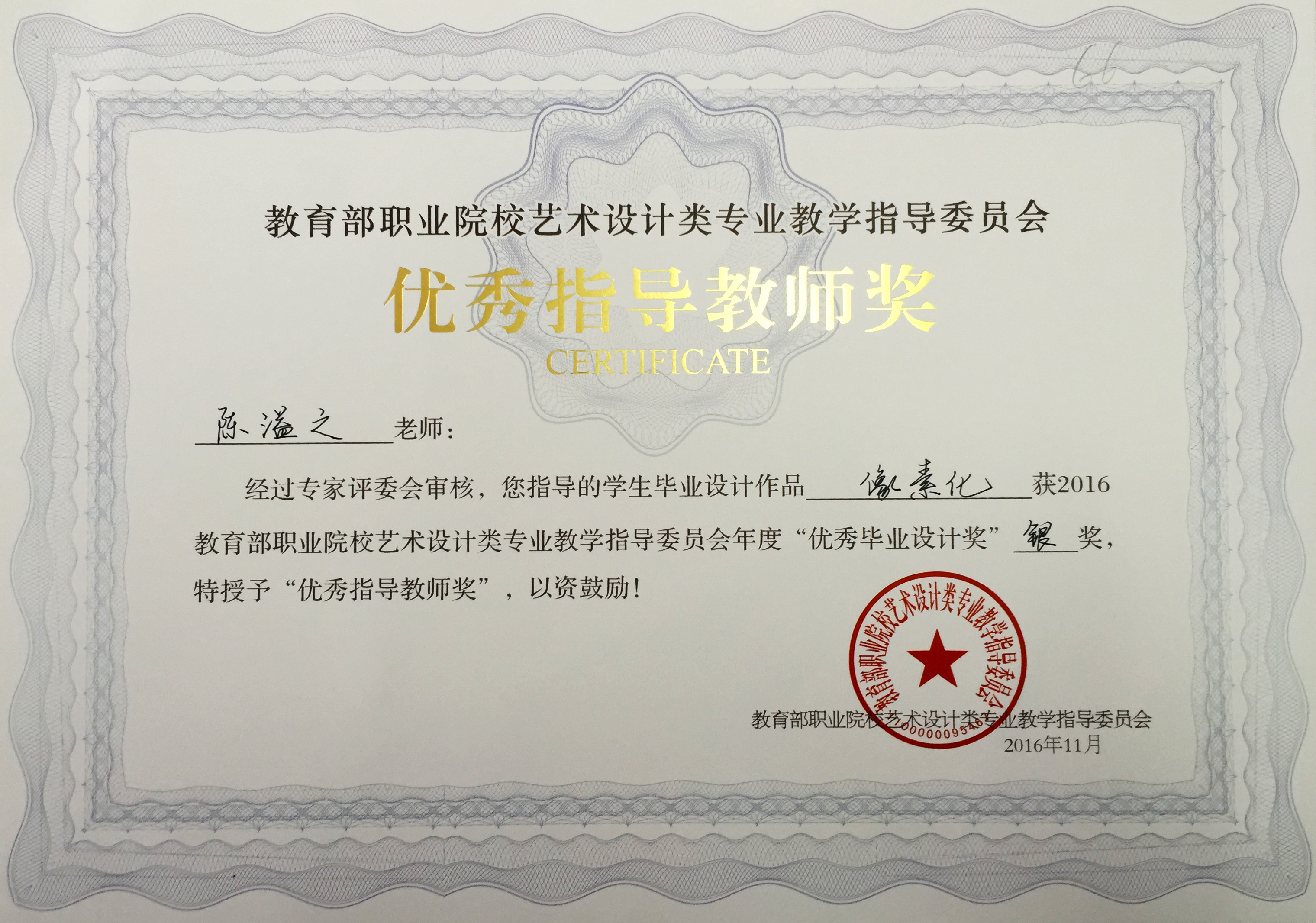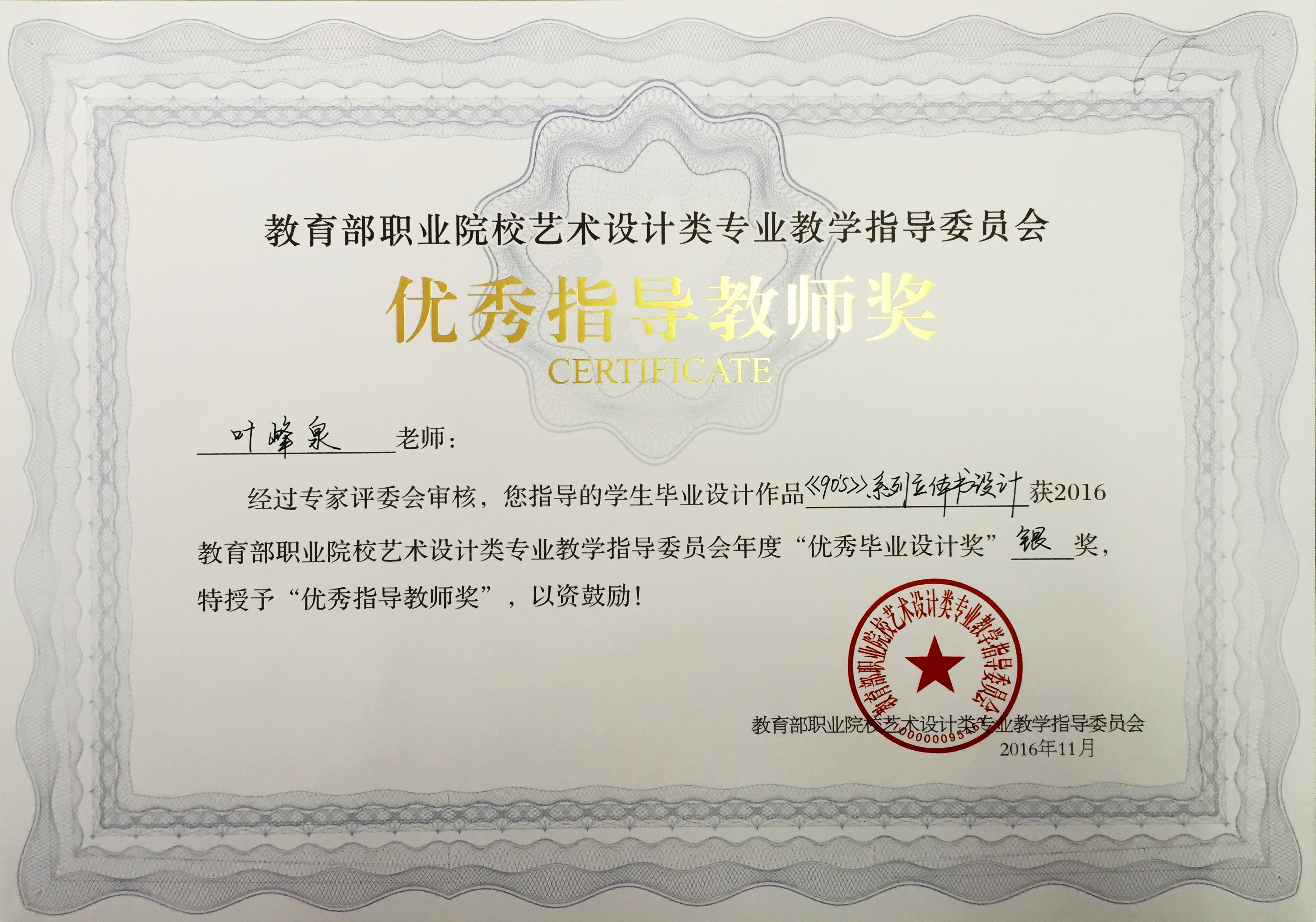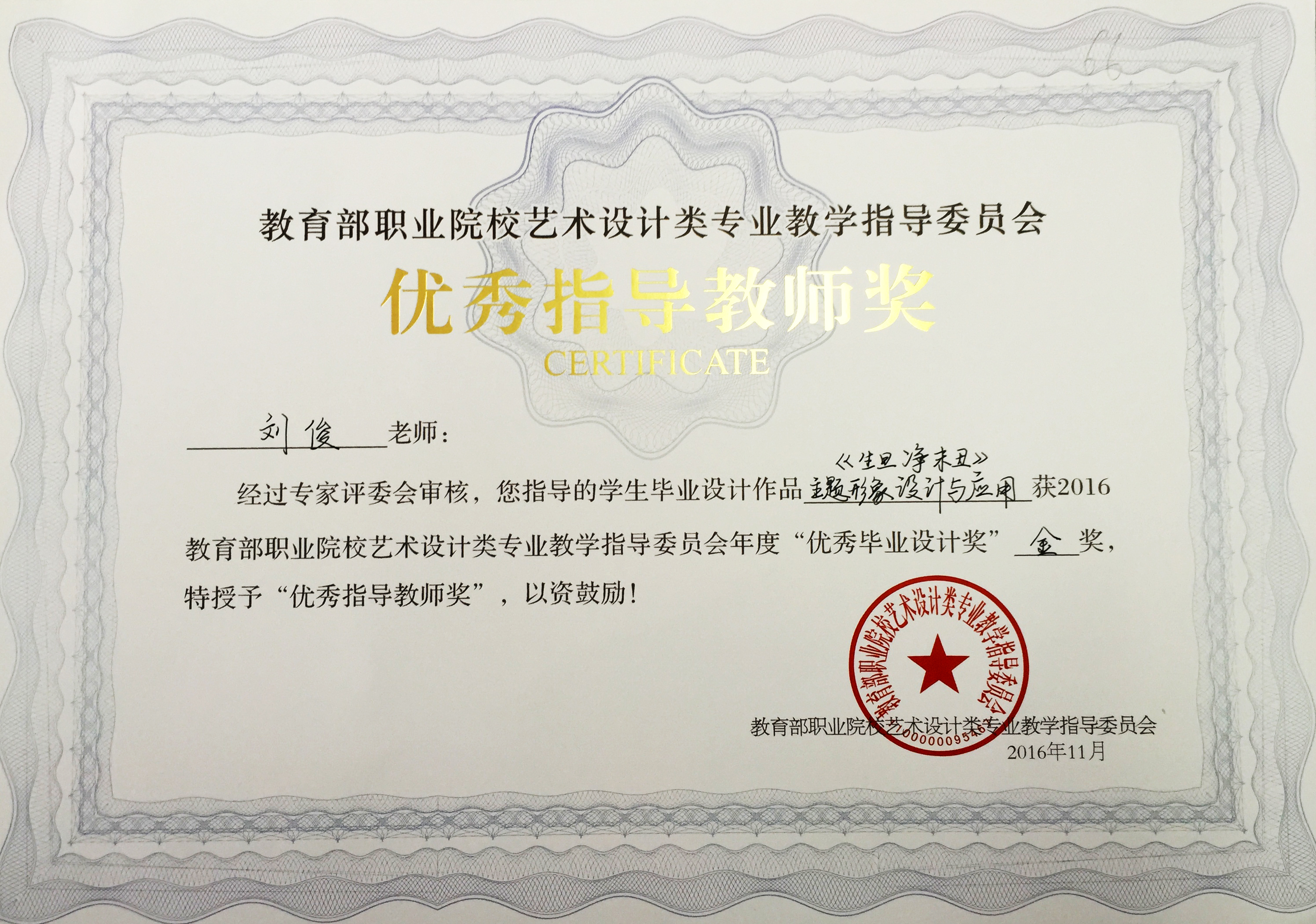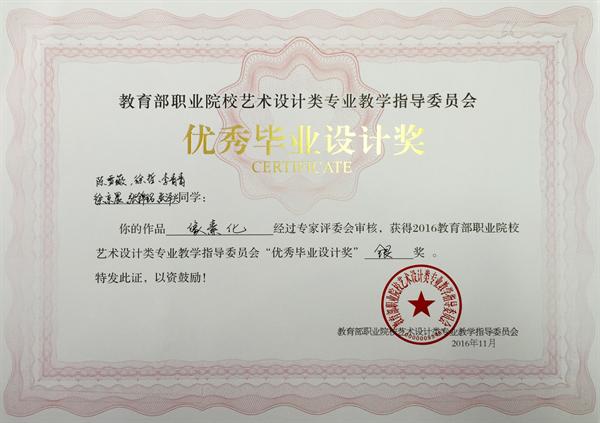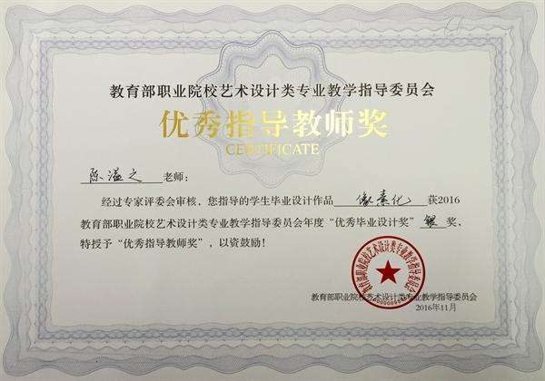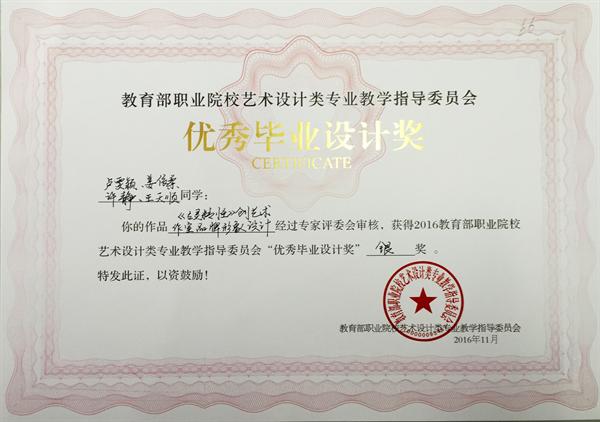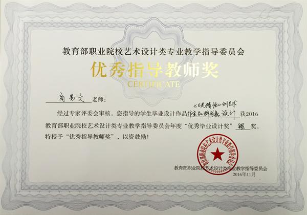 在刚刚落幕的教育部职业院校艺术设计类专业教学指导委员会举办的第九届艺术设计类专业学生 “优秀毕业设计奖”暨“优秀指导教师奖”的评选活动中,浙江艺术职业学院美术系广告设计教研室选送的四件作品从全国职业院校众多作品中脱引而出,获得一金三银的好成绩,四位指导老师获得“优秀指导教师奖”,其中刘俊获金奖,叶峰泉、商易文、陈溢之获银奖。
