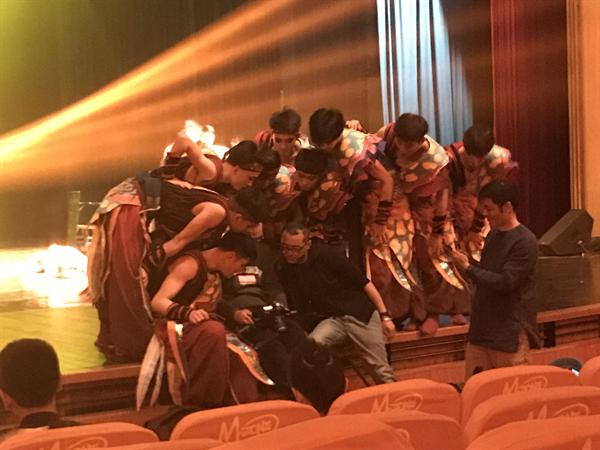 编创《凳之龙》节目的是我院青年教师包峥剡,他是遂昌人,从小看板凳龙长大,自己也属龙,龙图腾伴随他长大。这就是传统文化潜移默化的熏陶。学了舞蹈编导后,他一直想编一个和龙有关的节目。2012年开始构思,2013年筹划,经过这两年准备,2014年节目成型。《凳之龙》汲取了传统文化元素,结构上讲究从民族的精神意蕴出发,从赵钱孙李周吴郑王百家姓代表的龙的传人角度演绎,扩大板凳龙的内容和它衍生的意义。“我们多次到金华采风,到当地人家里,积累观察民风民俗是怎样的,传统表达是怎样的,但我们不能把它原样搬上舞台,还要提炼出一种精神。我就把它升华为民族的图腾,龙的传承,从这方面做了《凳之龙》的编创。”面对着中国教育台镜头,包峥剡倾吐了自己的舞蹈创作思想。