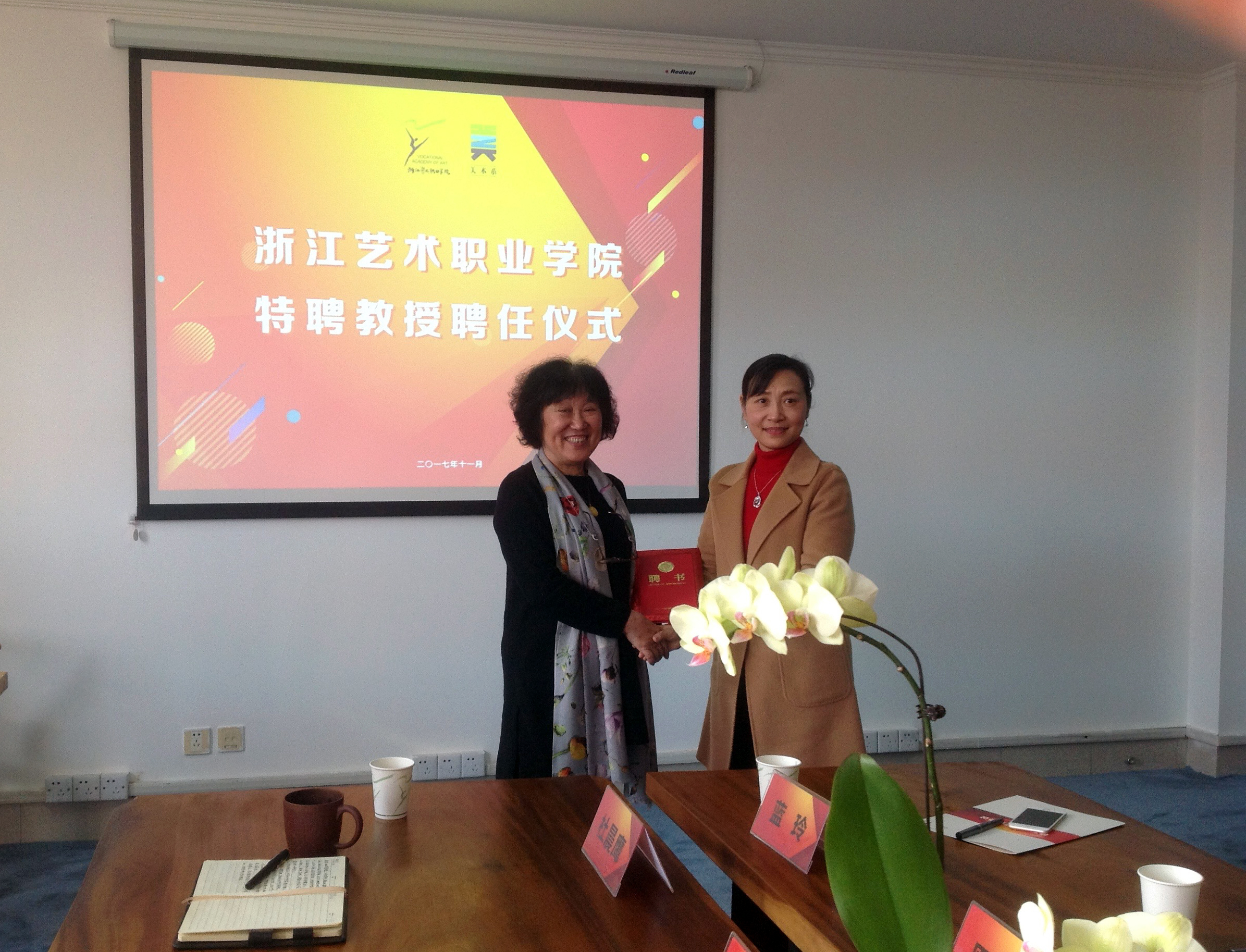 为进一步推动舞台艺术设计与制作专业、服装与服饰设计专业的发展,加强舞台设计、灯光设计、数字媒体、舞台服装等实践项目的工学合作开展,培养新时代舞台艺术设计、服装与服饰设计人才,打造“浙艺大舞美”品牌特色优势,浙江艺术职业学院特聘聘任国家一级舞美灯光师、中国舞台美术学会副会长、浙江舞台美术学会会长周正平教授和国家一级舞美设计师蓝玲为美术系特聘教授。11月22日下午,聘任仪式在美术系专家工作室举行,浙江艺术职业学院院长、党委副书记黄杭娟、美术系领导班子及专业学科带头人、各教研室主任等参加了聘任仪式。