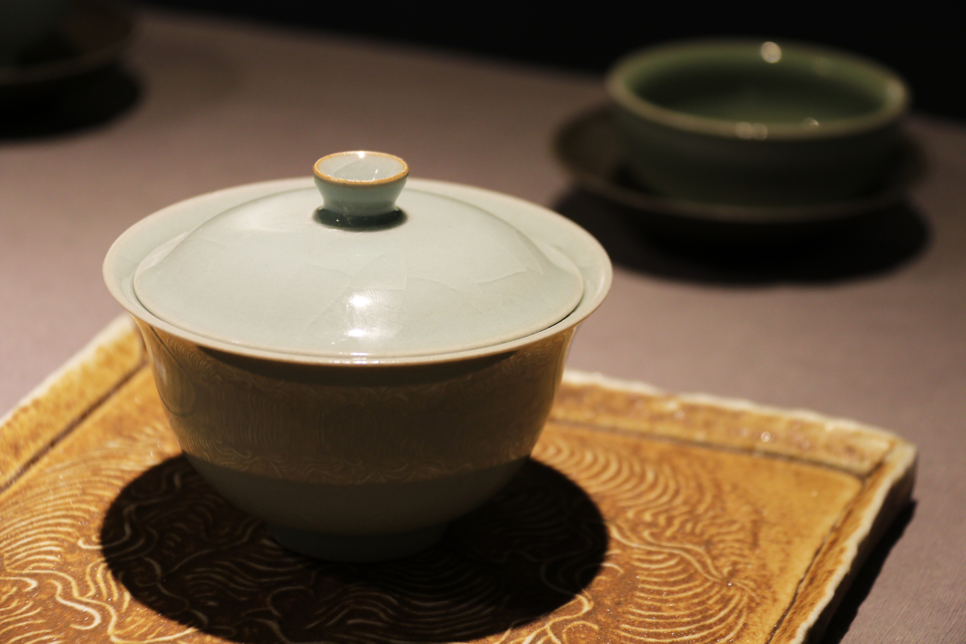 装裱作品分为字画修复与新画装裱。指导老师江杰老师说:“修复过程比较复杂,任何一步都不能错。”修复(画)共有五张作品,其中修复的画心都是从古玩市场淘过来的。字画修复总体可分为四个步骤:洗、揭、补、全,洗为清洗,揭为揭覆背纸和命纸,补为修补残破的地方 ,全为全色(补色)。这一组的展览作品制作了近一个学期,每一张修复画都要花一个月左右的时间来做。装裱部分皆按传统手工书画装裱,裱件干净清爽,笔挺柔软,清新雅致。陶艺由泥土拉坯成型,晾至七分干,接着修坯,上釉,最后烧造而成。短短一句话概括了过程,但实际却并不简单,前后花时几周甚至更长。在傅菲菲老师与郑源雷老师的指导下,陶艺组做了许多精美的作品,有各种各样的杯子,以脚胎、青瓷为主;还有小巧的泥片,样子方方正正的,似个薄薄的方盘,以刻划花为主要纹饰,再施上晶莹的釉水,烧造出来的样子十分精致。作品中还有各式贯耳瓶,器形都是形态不一的。这些作品中比较有代表性的是俞骏昊同学的“鹰首壶”,仿东晋越窑的器型,鹰首、鹰爪、鹰尾都做的相当逼真,精湛的技艺获得了围观者的好评。