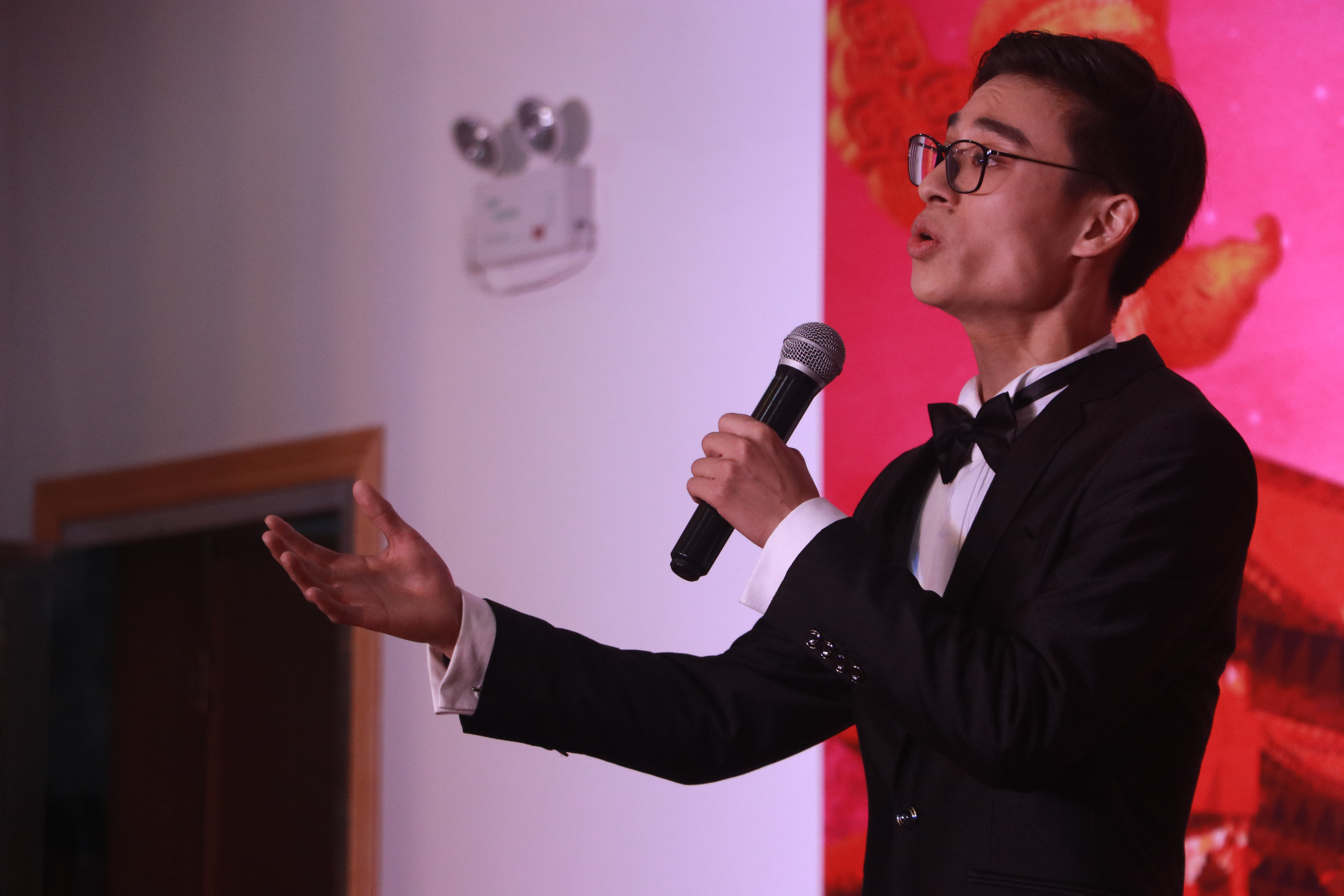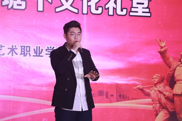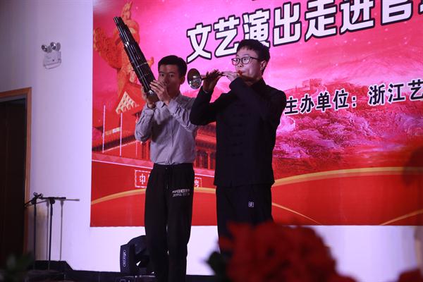 理想的双桨,捧起祖国的太阳。音乐系学子以一首激昂澎湃的《红旗颂》拉开了此次专题晚会的帷幕。当晚官塘下村的文化礼堂里座无虚席,满堂喝彩。村民们在音乐系师生精心准备的文艺节目中感受到了艺术的魅力。此次专题晚会共十二个节目,其中二胡重奏《新赛马》由青年教师卢伟与他的四名学生共同演绎,精彩的变奏、欢快的旋律,为听众营造出了骏马奔腾激越纵横驰骋的壮丽景象。学生党员王立凯、胡淑雅的男女声二重唱《记住乡愁》,悠扬的歌声仿佛穿越时光的隧道带着往事的浮尘来到大家面前,唱出了对亲人的思念,对故乡的牵挂。学生党员黄珞、董建磊为村民们演奏了经典唢呐曲目《百鸟朝凤》,优美的旋律将大自然生机勃勃的景象展现得淋漓尽致。黄珞同学精湛的技艺完美地演绎出唢呐独特的韵味。晚会尾声,一首大气磅礴的《中国进入新时代》掀起了当晚汇演的高潮。《中国走进新时代》由浙江省文化厅副厅长刁玉泉作曲,坚定有力、大气磅礴的旋律象征着从百年风雨中走来的中国正以昂扬的姿态迈向崭新的时代。吟盛世,颂伟绩,这是音乐系全体师生对祖国未来的美好祝愿与热切期盼!