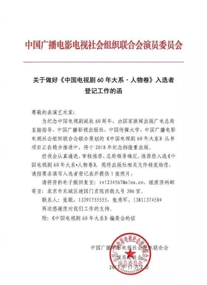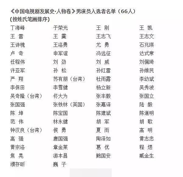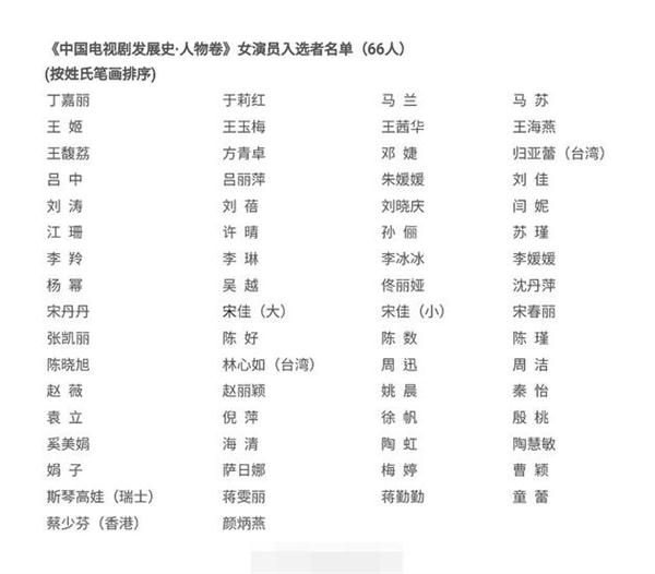 经中国广播电影电视社会组织联合会认真遴选、审核推荐,总局领导确定,推荐以下132位(男女演员各66位)演员入选《中国电视剧60年大系·人物卷》。