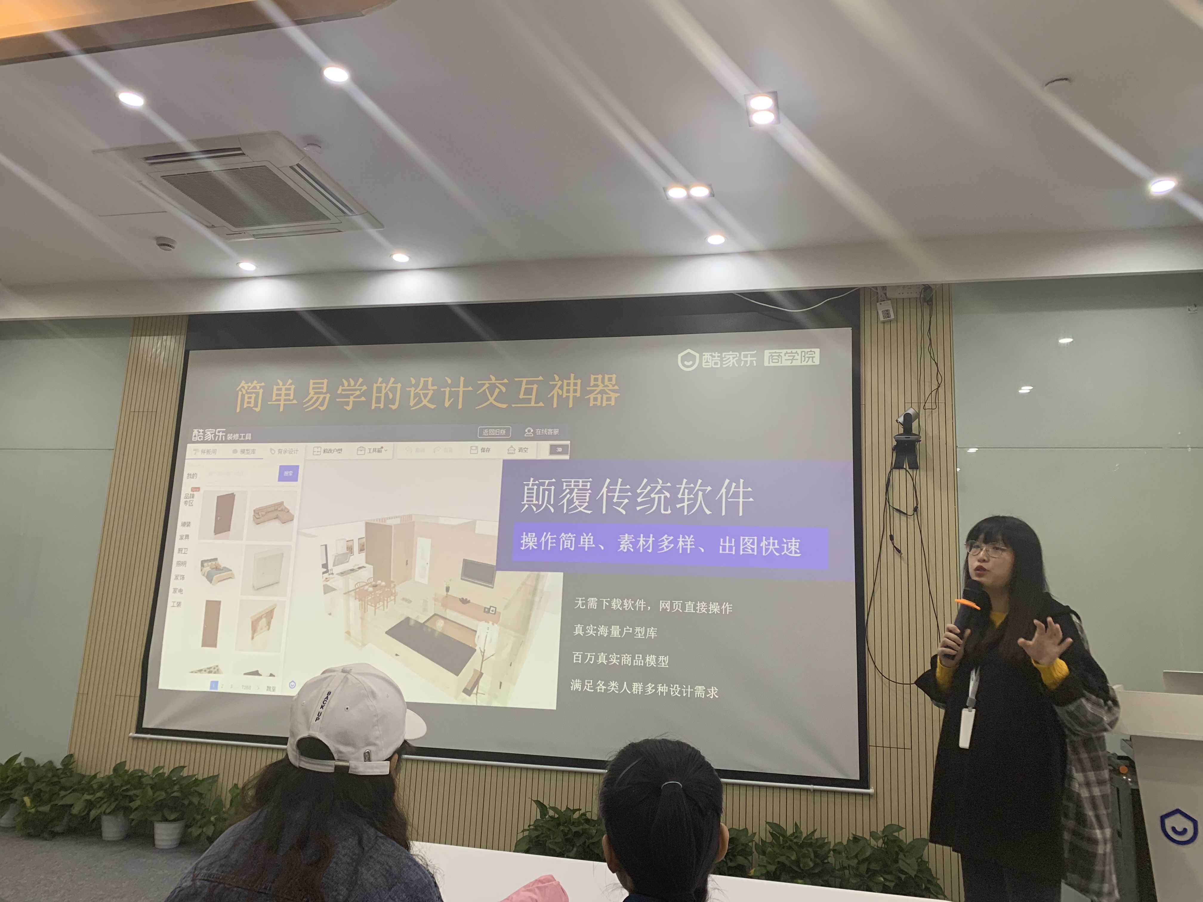 杭州群核信息技术有限公司酷家乐商学院钱老师为17环艺班授课,授课主题为《科技赋能 打造未来设计新生态》。钱老师介绍,酷家乐云平台是以分布式并行计算和多媒体数据挖掘为技术核心推出的VR智能室内设计平台。通过ExaCloud云渲染技术,云设计、BIMVRARAI等技术的研发,10秒生成效果图,5分钟生成装修方案。酷家乐用户可以通过电脑在线完成户型搜索、绘制、改造,拖拽模型进行室内设计,快速渲染预见装修效果目前,平台拥有覆盖全国90%的户型库,吸引了超过300万室内设计师(覆盖全国40%的室内设计师)和超1000万业主用户。酷家乐已服务于小米、美克美家、林氏木业、顾家家居、博洛尼等12000家品牌企业,市场覆盖率超过70%