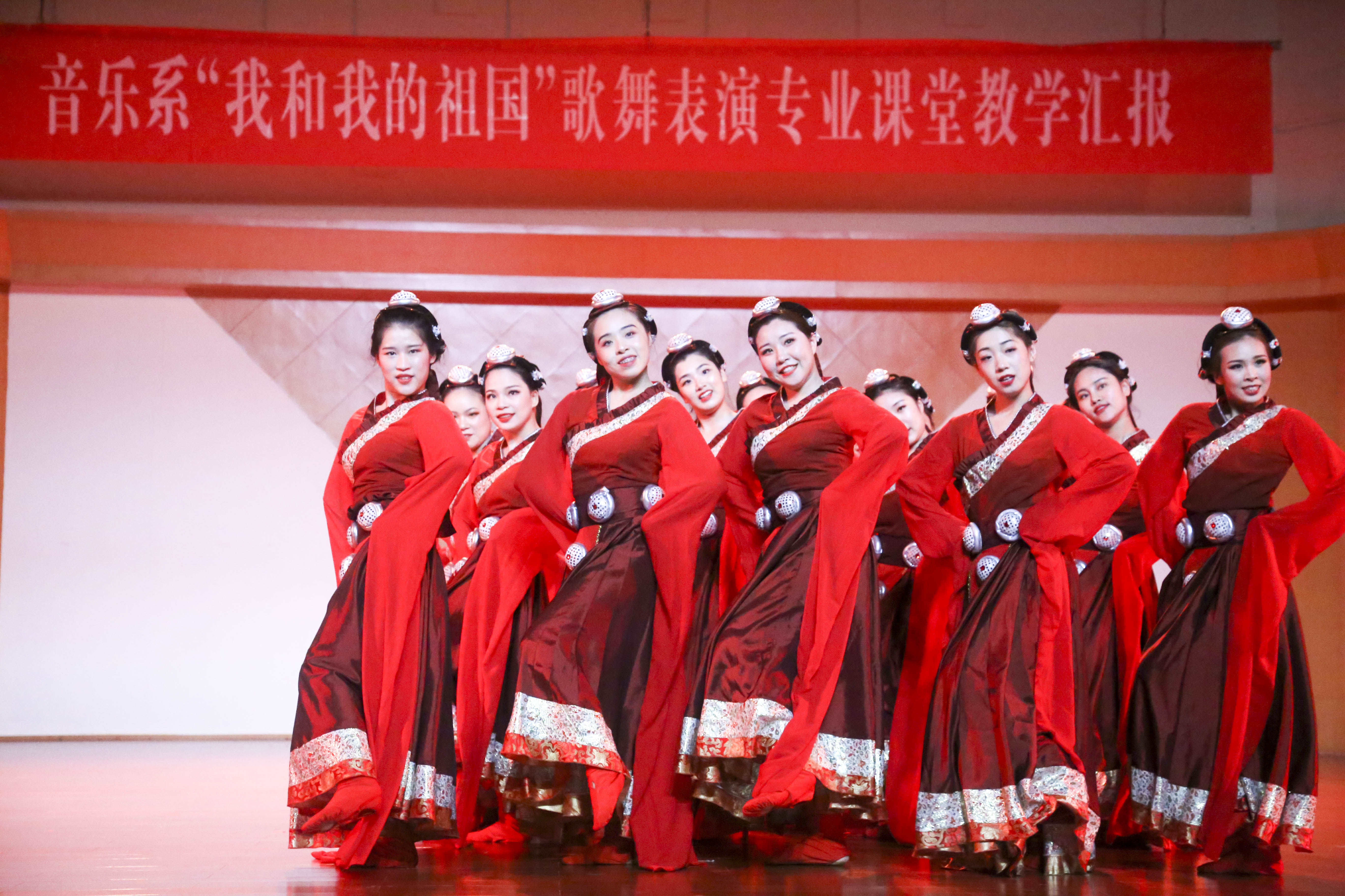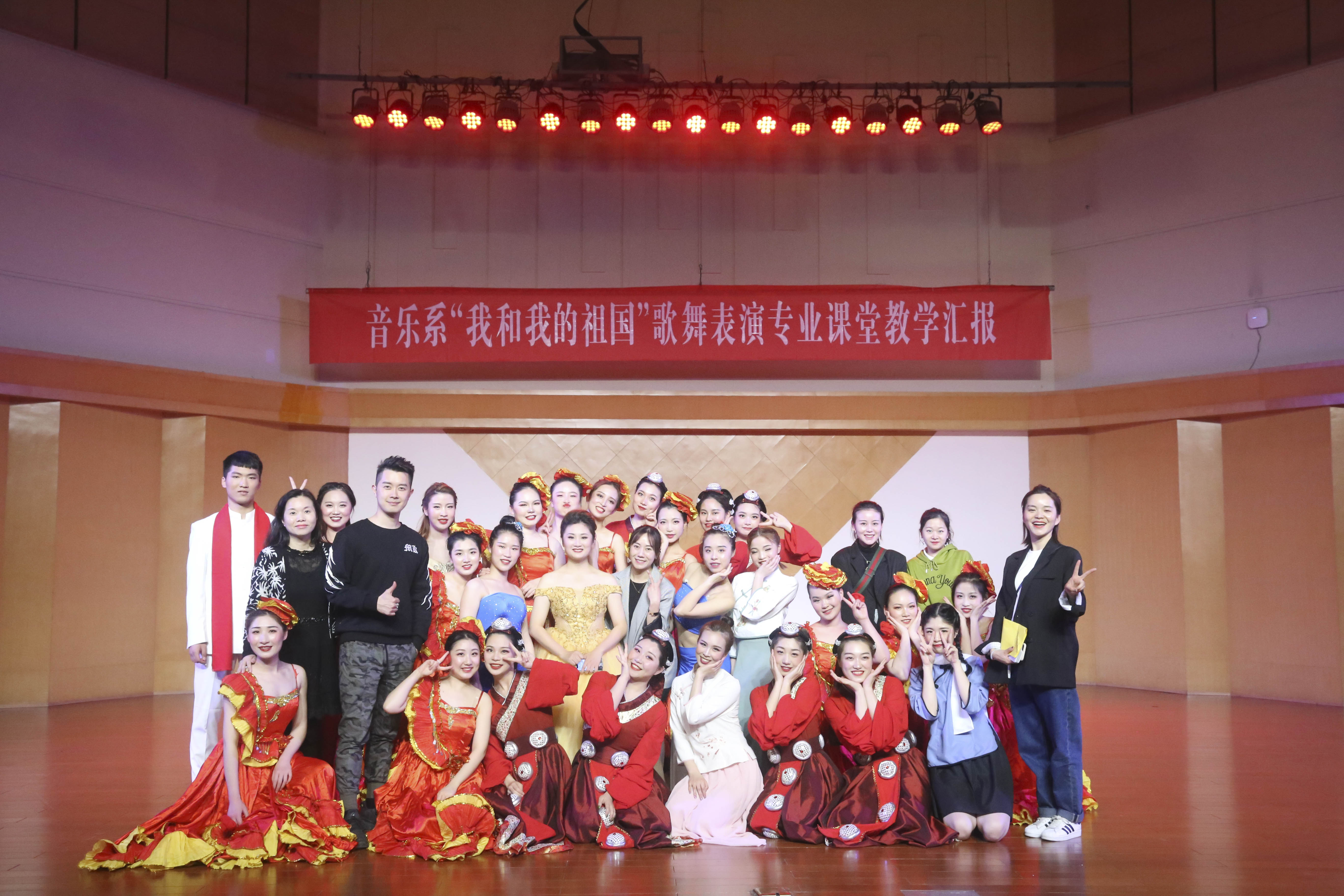 歌舞庆盛世,献礼70年。为献礼新中国成立70周年,颂扬心系祖国的爱国情怀,弘扬和传承中华民族文化,丰富校园文化生活,展现音乐系歌舞表演专业教育教学成果,4月15日,以“我和我的祖国”为主题的歌舞表演专业课堂教学汇报在学校音乐厅上演。校党委书记朱海闵莅临汇报演出现场,音乐系16歌舞一贯班、17歌舞大专班全体学生担当主演,音乐系师生代表两百余人观看演出。