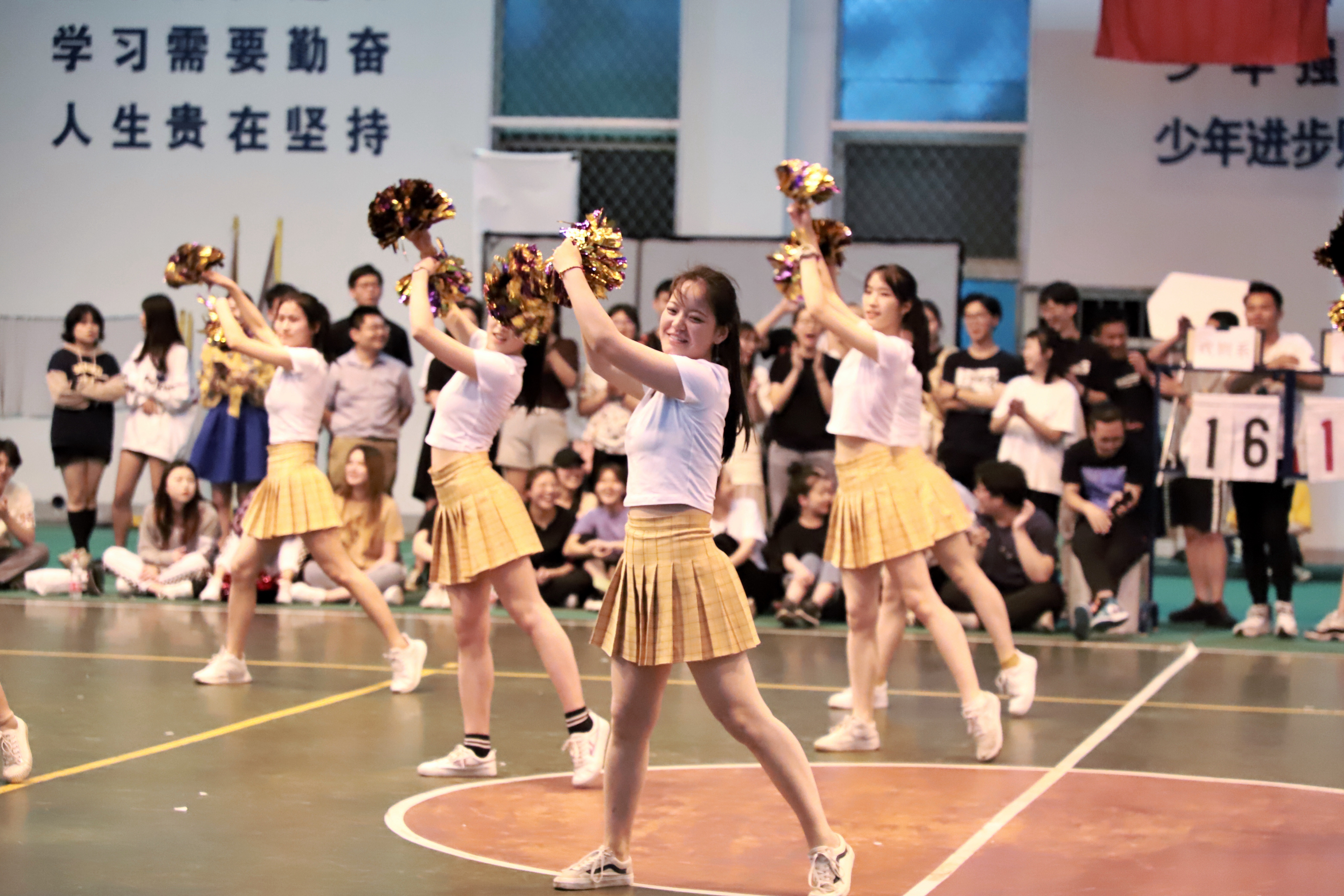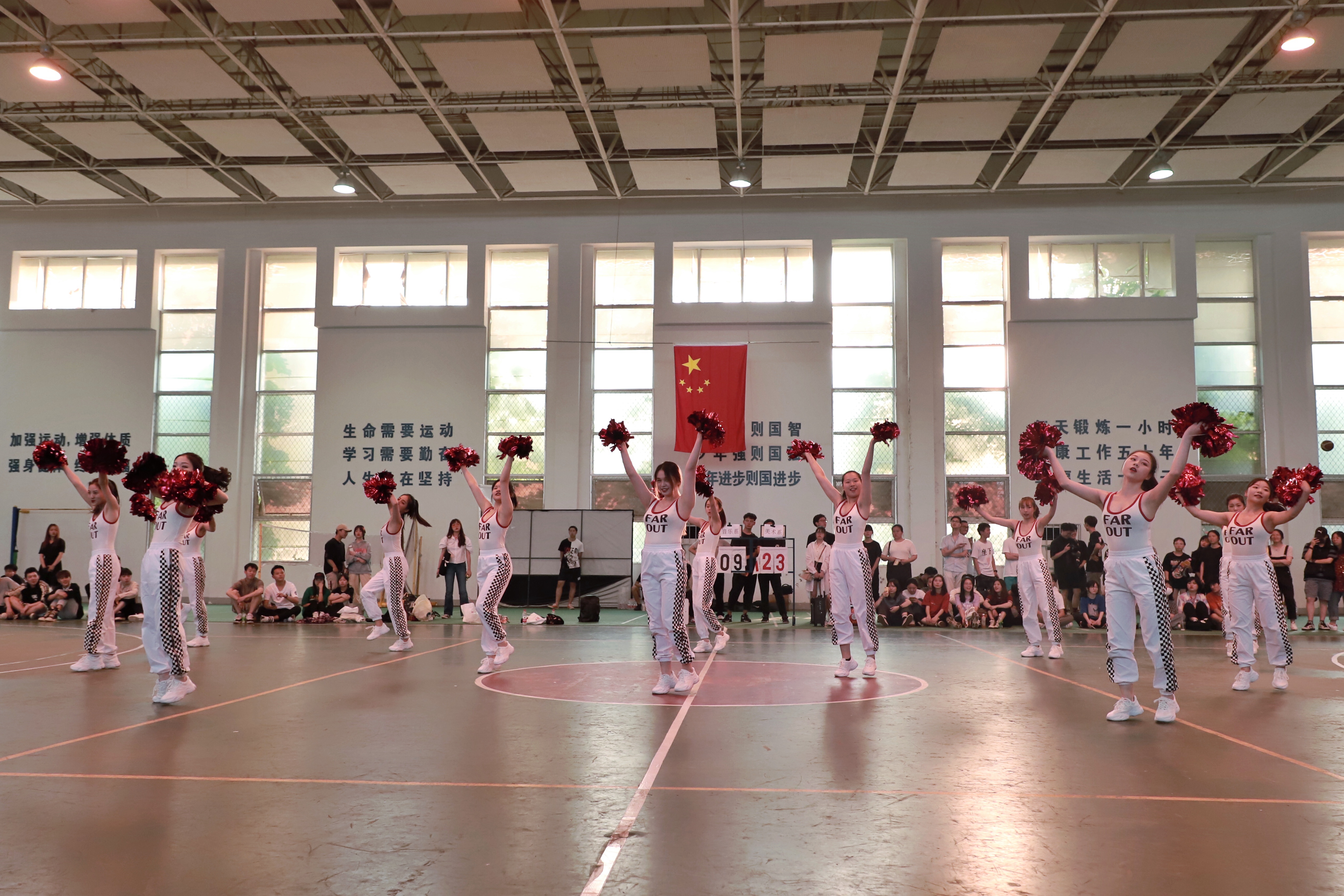 答:这个曲目是我们舞蹈老师选的,因为考虑到要调动现场气氛,我们就挑选了节奏比较明快的,比较嗨的曲目进行搭配啦啦操。(比赛分规定套路和自选套路,规定套路音乐由组委会提供,自选套路由各系自行决定)