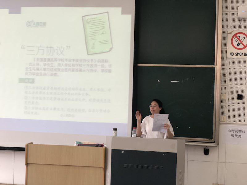 陈丽丽对业生就业材料、就业手续、毕业生派遣做了详细介绍;对就业推荐表、三方协议、报到证、档案、户口、二次派遣等做了逐一解读;对毕业生落户手续、就业手续办理等回答了毕业生提问;对毕业生具体派遣流程和重点注意事项使提供了清晰解答