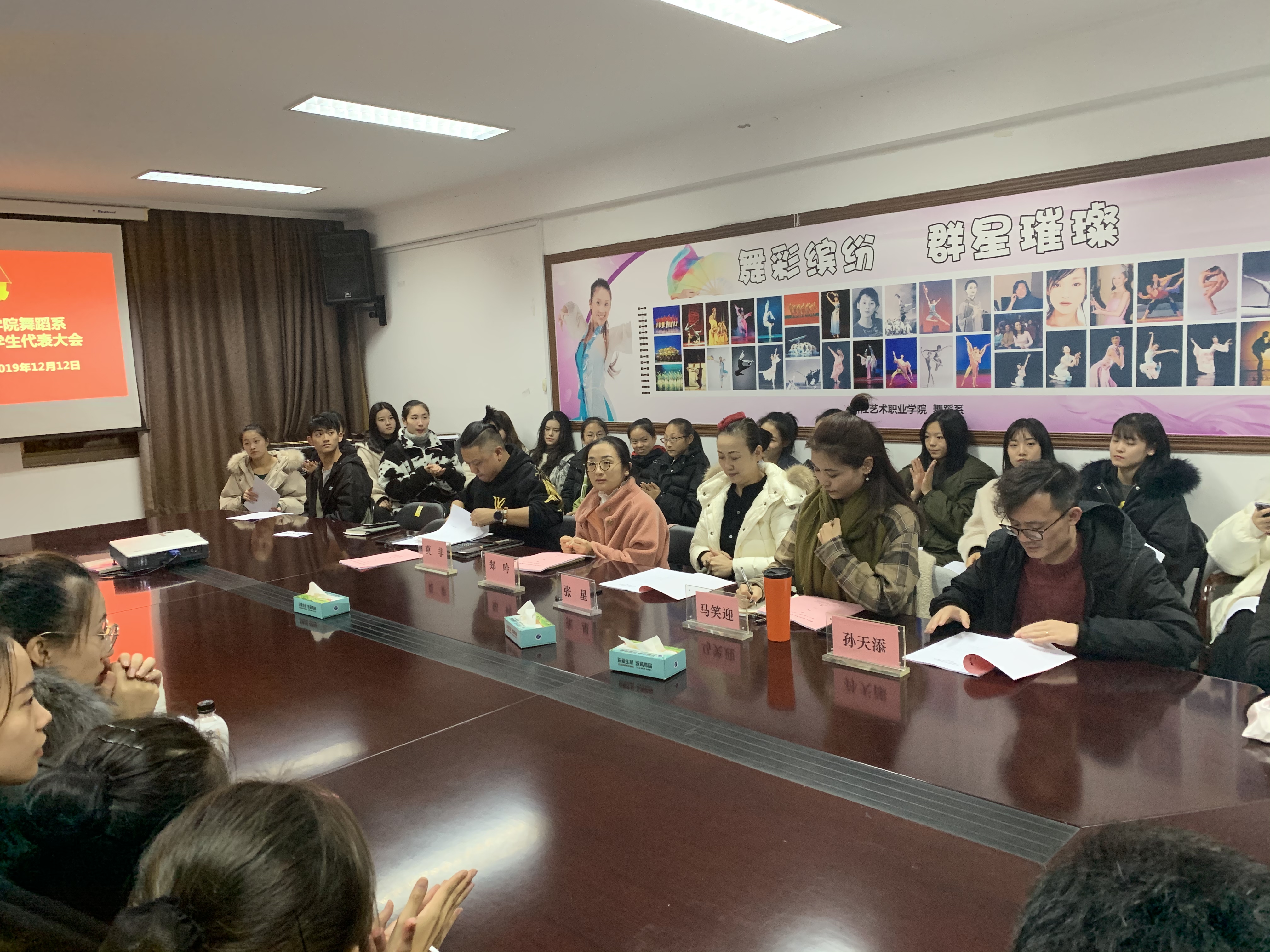 12月12日,舞蹈系第十八次团员、学生代表大会在4409会议室热烈举行。校团委书记郑吟,舞蹈系主任张星、党总支专职副书记马笑迎等参加大会。