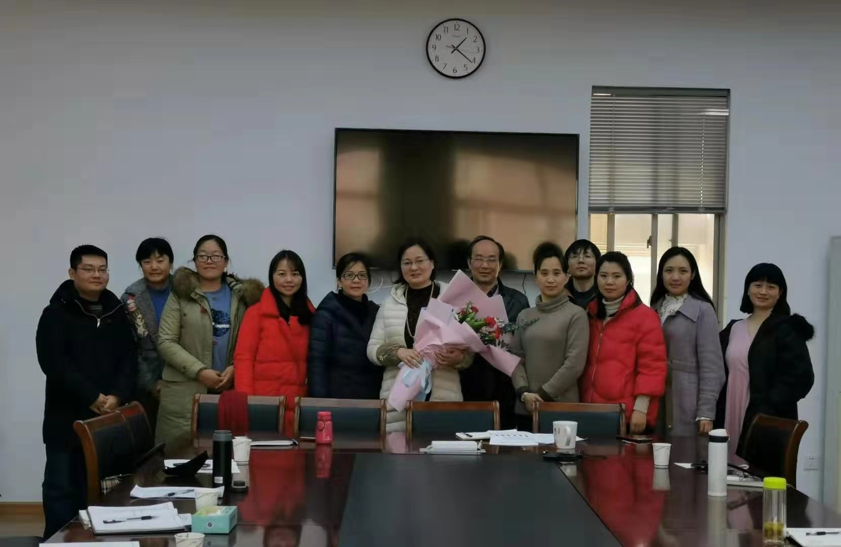 随后,全体教师为年底光荣退休的王占霞教授举行了荣休仪式。刘秀峰代表社科部对王占霞教授长期以来对社科部的奉献与付出表示感谢,希望王老师“人退心不退”,继续支持并关注社科部的发展,为社科部的建设和发展献计献策,并希望能增强与离退休教师的联系,欢迎王老师常回家看看。活动进行中,刘秀峰、胡卓群、孙彪三位老师为王占霞教授送上了鲜花和纪念品,祝愿王老师在退休生活中身体健康,生活美满。