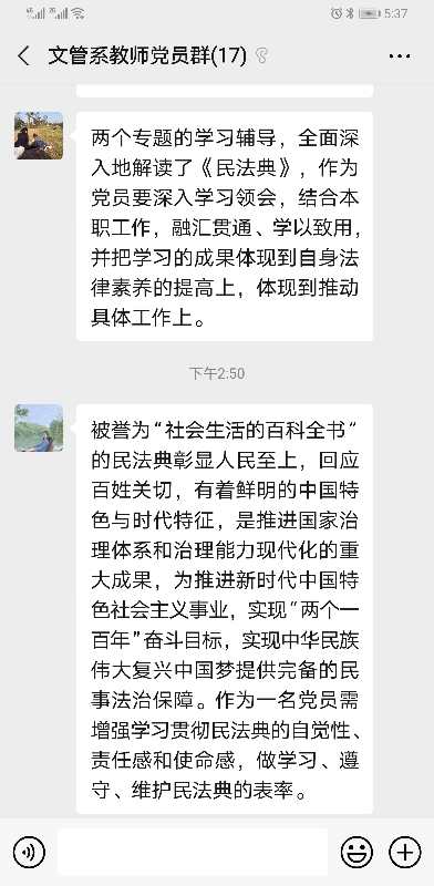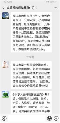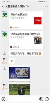 为深入贯彻落实习近平总书记“要宣传、推进、保障民法典实施”的重要指示,切实推进民法典普法工作7月8日文化管理系党总支开展学习《中华人民共和国民法典》主题党日活动,系全体党员教师通过学习强国平台集中学习了民法典系列视频公开课,结合线上学习和讨论,逐步将民法典精神学深悟透。视频观看结束后,党员教师纷纷交流了学习感悟与体会。