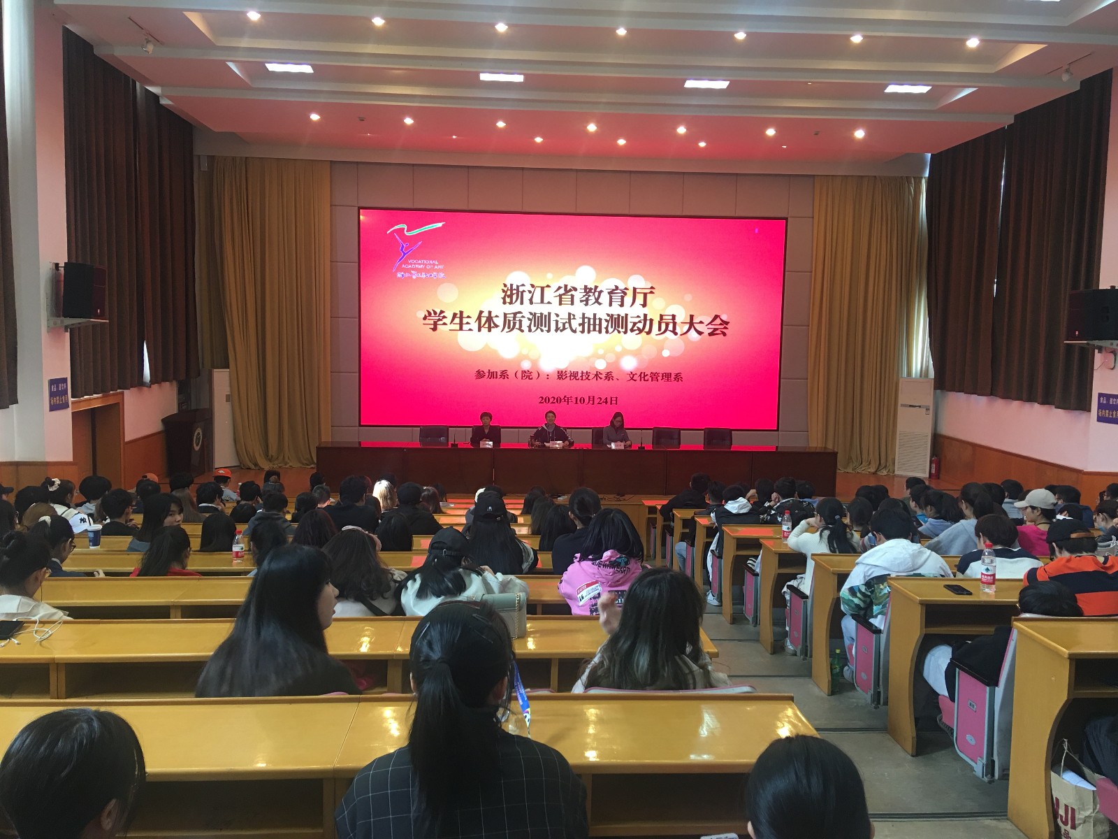 为迎接浙江省教育厅对我校学生的体质测试抽查,1024日,基础教学部(公共体育部)在图信中心报告厅召开学生体质测试抽测动员大会。基础教学部(公共体育部)党总支书记、副主任(主持工作)郑园全,影视技术系党总支专职副书记王筱芽,文化管理系党总支书记金银琴以及参加浙江省教育厅学生体质测试抽测的240名学生参加动员会。