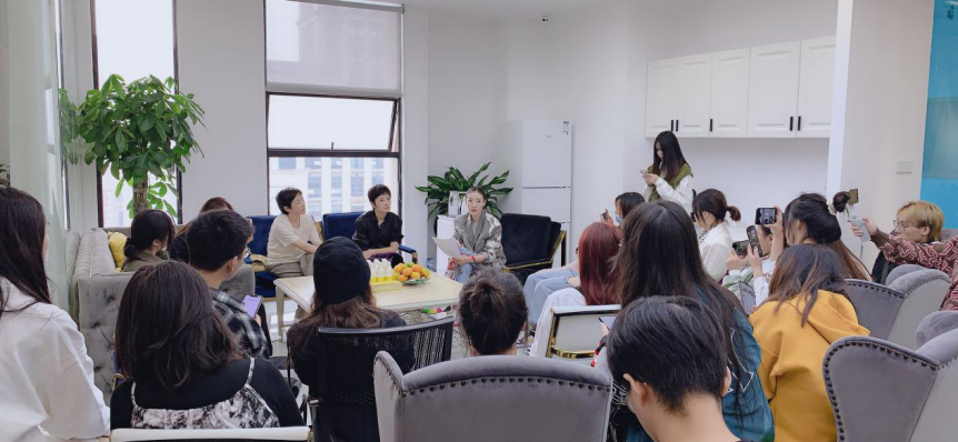 在赢嘉设计有限公司总部的课堂上,企业导师任敏介绍了一线时装行业的设计工作流程、皮革市场消费趋势与零售概况,并给同学们讲解了具体皮革皮草服装工艺、面料、细节等专业知识。