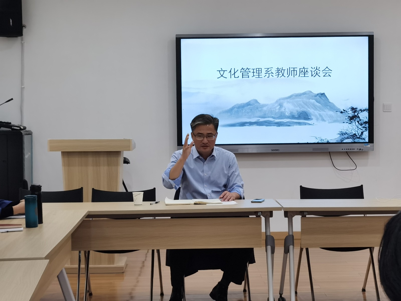 10月29日,文化管理系在图信中心召开全系教师座谈会,校党委书记薛亮出席会议,系全体专任教师参加会议,会议由系主任刘秀峰主持。