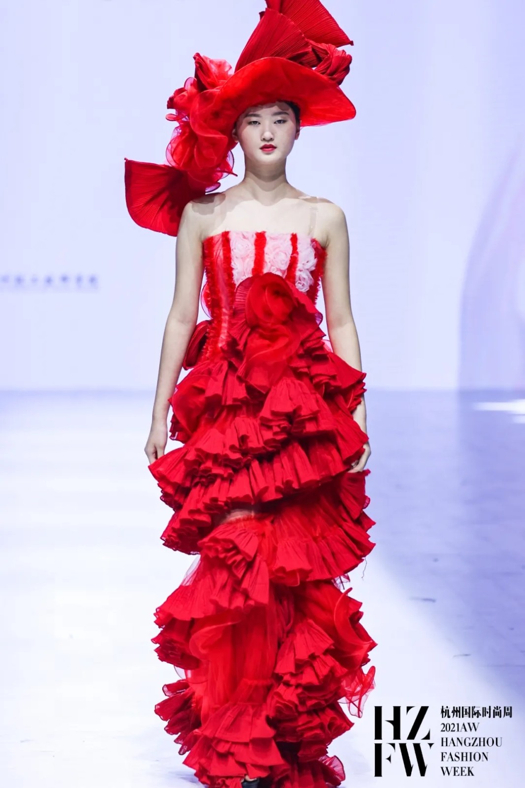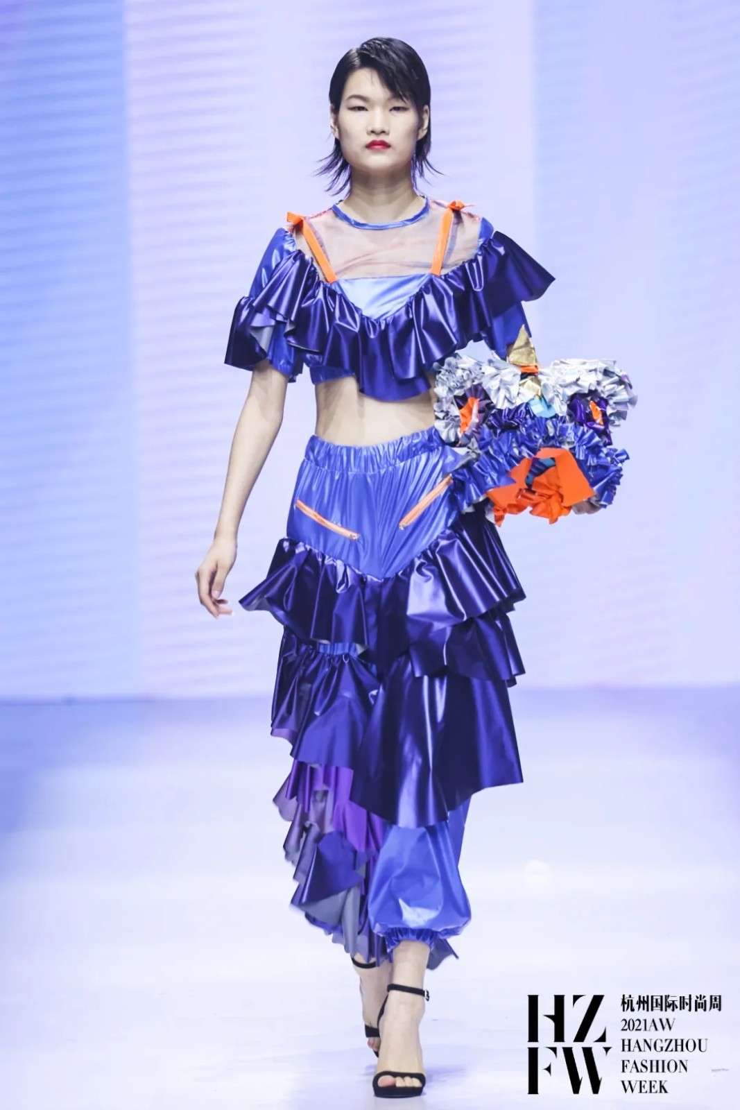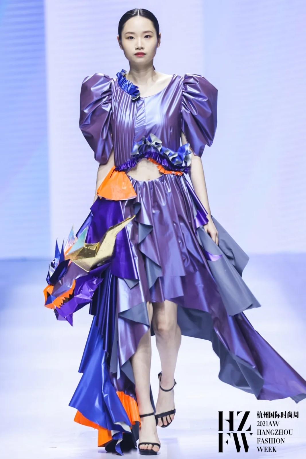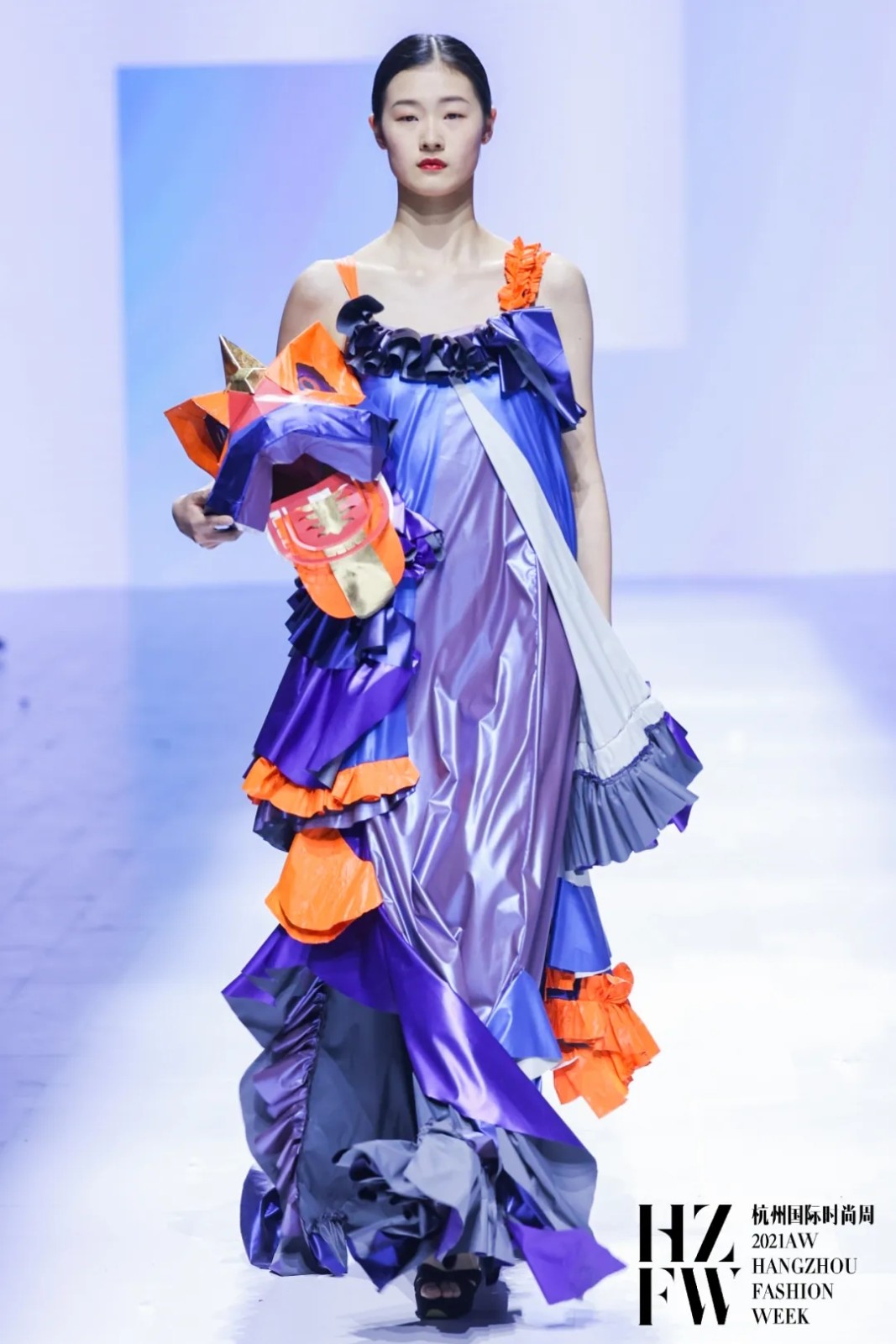 灵感来源中国非物质文化遗产——舞龙和舞狮。在款式设计上,把中国传统文化与荷叶边相结合,以层层叠叠的荷叶边作为细节加强服装的立体效果。在色彩上,以蓝色系和紫色系为整个系列的基调色,佐以橙色点缀,凸显褶裥的各种变化。在头饰设计上加入了舞狮的灵感,传承了中国文化的精髓。