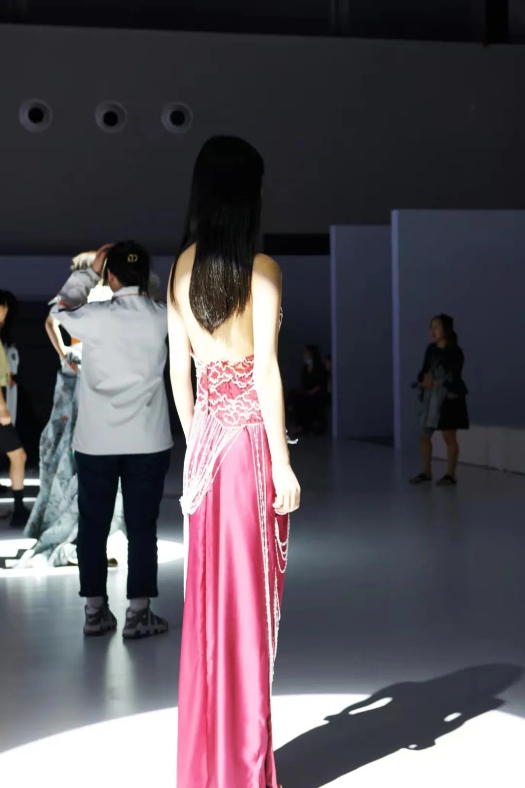 5月20号之前开始前期准备,试装、服装排序排系列、拍照备用、复抄表格、制作ppt,各种幕后事务都由我们的老师和学生工作人员完成,这两天里,师生全都紧崩着一根筋,在走秀前核对每一项流程,初次彩排、二次彩排、化妆、联排,与时间赛跑…