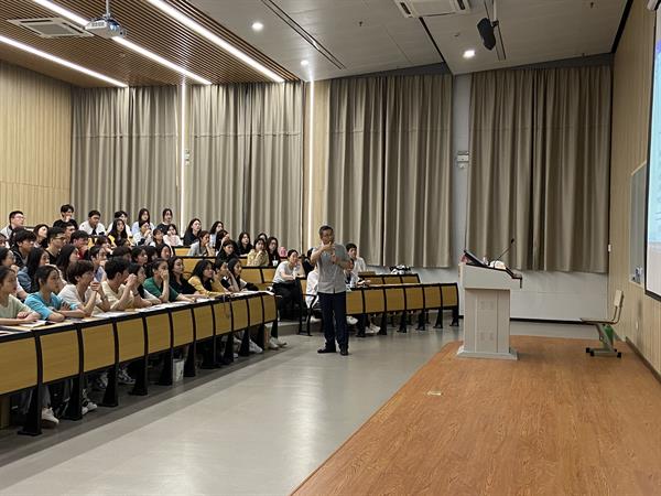 褚老师通过热身活动“你来评评分”,调动同学们的积极性。针对《爱人始于爱己,爱世发于爱人》和《兼爱人生》两篇论述文,同学们各抒己见,想法不一,整场讲座的“干货”由此开启。