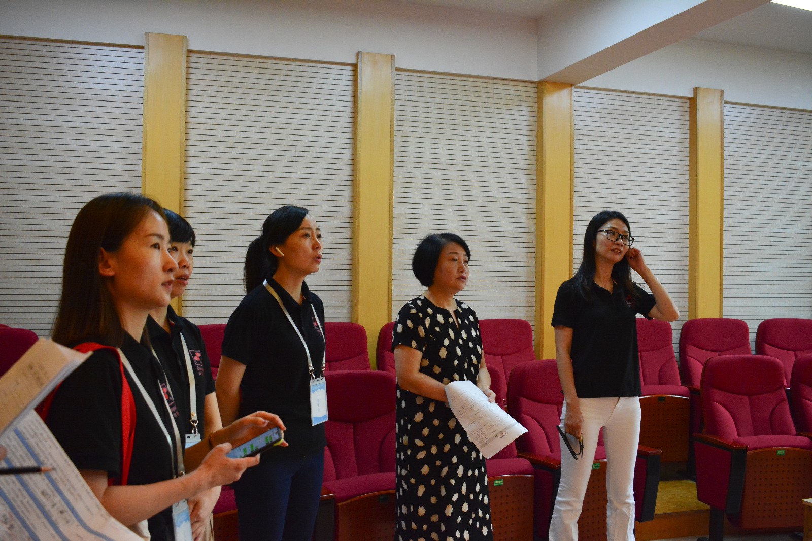 学校两位主持人也上台串词彩排,和模拟参赛选手一起,从规定歌曲演唱,到知识问答再到视唱,每个环节都进行了仔细的确认,确保现场不出现失误。支涛提出,细节体现学校的专业管理,大家要不厌其烦,一一到位,更好地呈现出我校对此次承办国赛的效果。