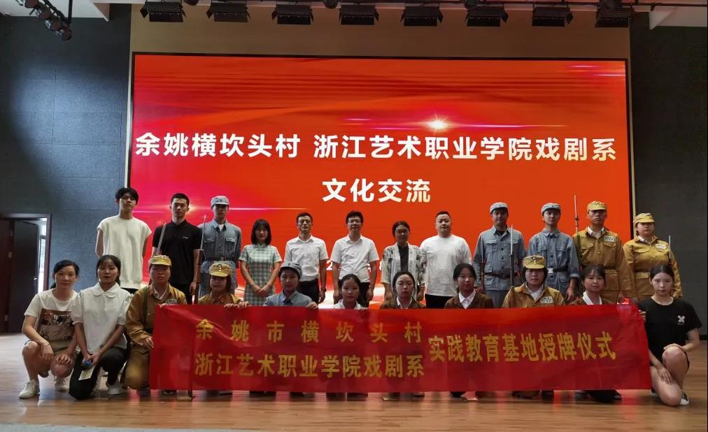 8月6日,戏剧系实践团队师生来到横坎头村村委会,举行实践教育基地授牌仪式。余姚市梁弄镇人大主席、横坎头村党委书记黄科威,余姚市姚剧保护传承中心主任、戏剧家协会主席倪乐辉,余姚市工商联副主席、原余姚市文化馆馆长、舞蹈家协会主席金晶,戏剧系党总支专职副书记许瑛,戏剧系专业教师齐帅和辅导员王玉簪等参加授牌仪式。会上,黄科威介绍了横坎头村的基本情况,他表示,实践教育基地是横坎头村与浙江艺术职业学院戏剧系交流的重要纽带,希望双方在表演形式、宣传推介等方面开展深入合作,将横坎头的红色文化以艺术形式打造成红村剧场品牌,立足宁波,辐射浙江。许瑛介绍了学院及戏剧系的特色与优势,并表示,实践基地的落地标志着双方的合作迈上一个新台阶,学校将与横坎头村共同传承和发扬红色文化艺术,为乡村振兴赋能。