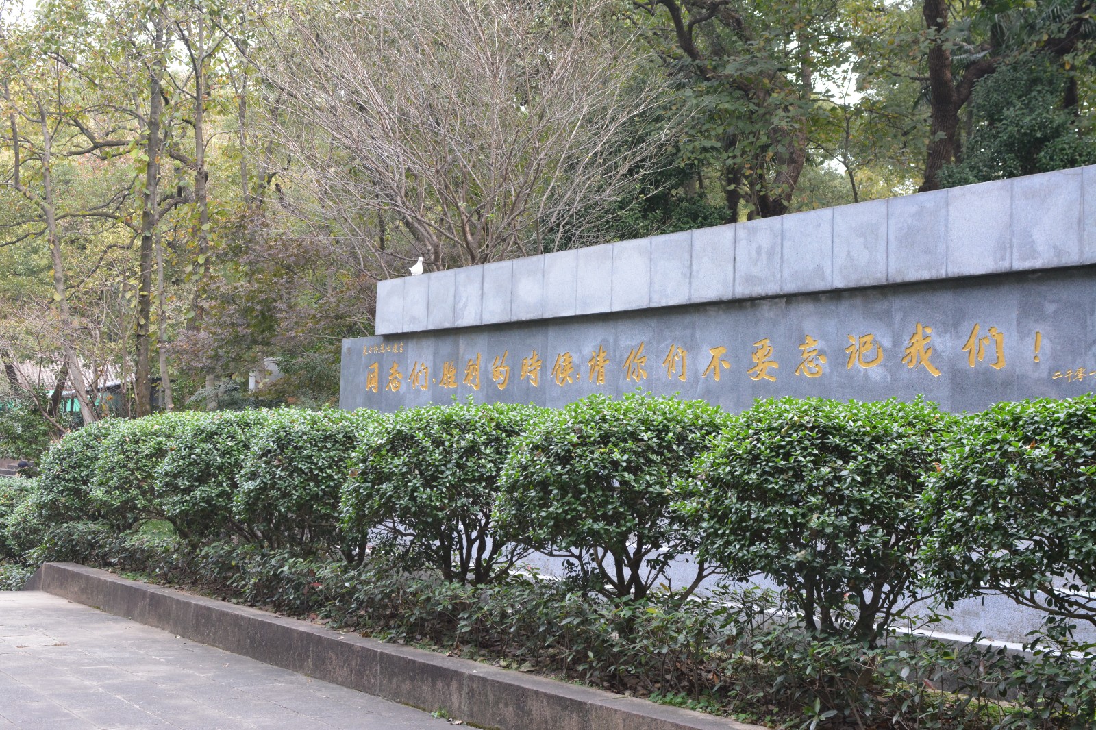 山脚下柏油马路两旁的樟树成荫,葱茏茂密,革命英雄的功业万古长青。顺着一级级青石台阶向上,转角便能看到一座石壁,上面刻着“同志们,胜利的时候,请你们不要忘记我们。”这是先辈们就义前的呐喊,也是后辈们不能忘却的岁月。继续向上攀登,高耸的革命烈士纪念碑巍然屹立。