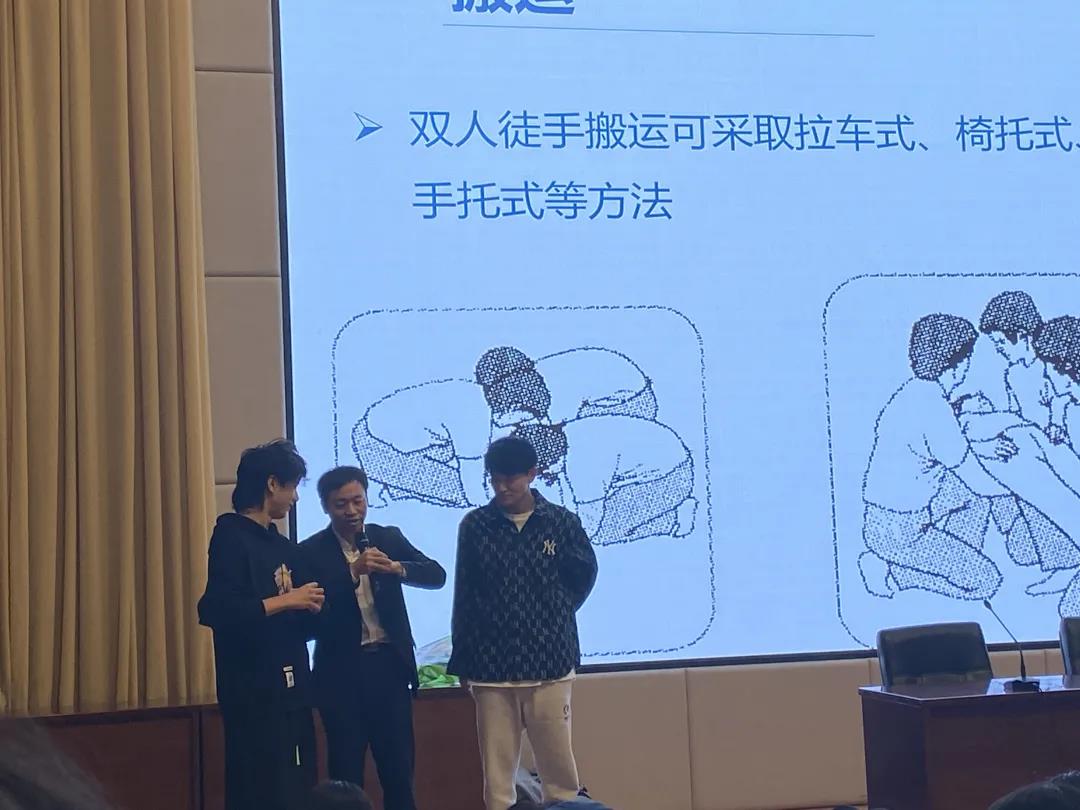 廖医生由心肺复苏、海姆利克急救法、止血方法、骨折处理等方面展开急救重要性、理论知识和操作流程的讲解。他强调心肺复苏必须争分夺秒,复苏越早,存活率越高,同时注意操作要点:确认在安全环境、评估(识别意识丧失)、叫帮助,打120、尽快开始CPR(黄金4分钟)、高质量CPR(体位、姿势、按压部位、按压频率、按压深度、回弹等)、开放气道、人工呼吸、在有除颤仪的情况下给予除颤、病人有反应了停止CPR等。随后,廖医生分步骤、慢动作操作演示如何调整体位、打开气道、判断呼吸、人工呼吸、胸外心脏按压等急救法。演示之后,请学生代表上台进行现场模拟操作,手把手示教,纠正操作手法。