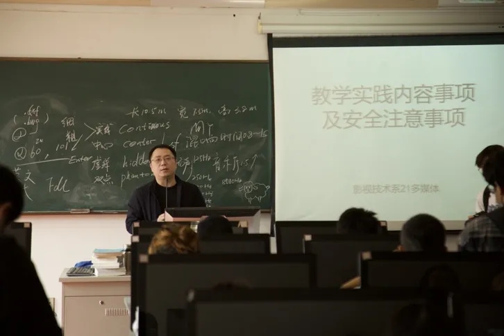 出发前多媒体技术教研室主任陈楠江于4313教室向同学们介绍了本次教学实践内容安排及安全注意事项。