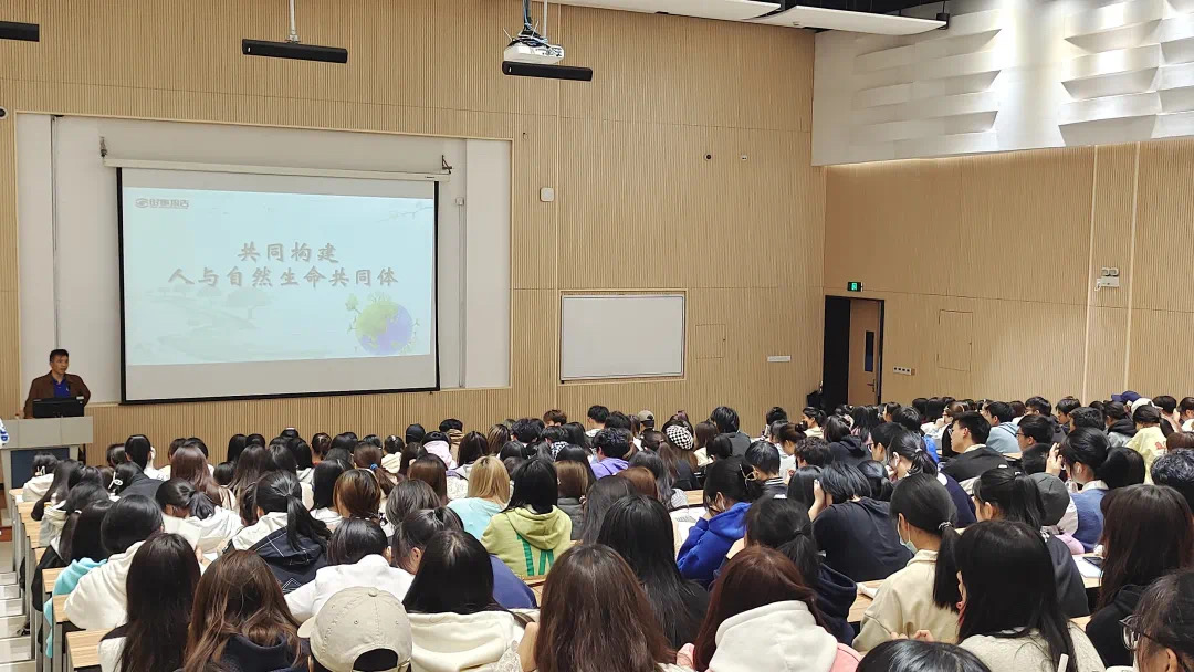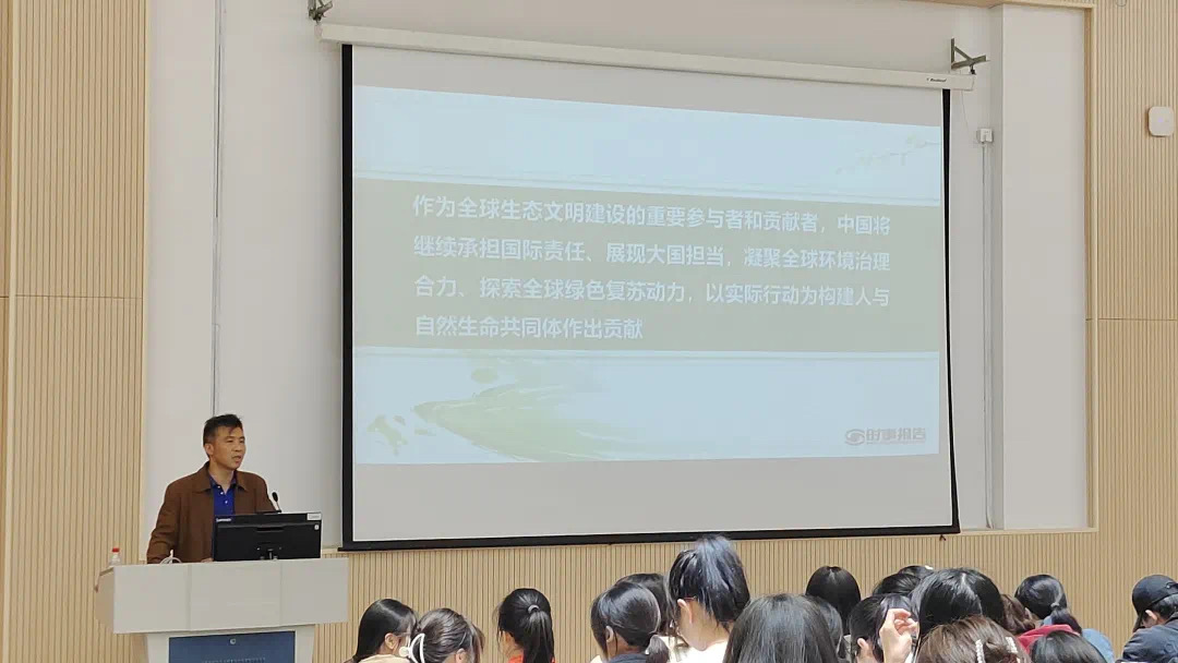 课上,沈军甫围绕“现实之困”“中国方案”“中国担当”三方面向同学们展现着了共同构建人类与自然命运共同体的重要性。他通过对自然因素与社会因素的结合举例,阐述了现实之困给人类带来的危害,以”一荣俱荣,一损俱损”的立场更深层的表示出当下环境问题的严峻性以及国际社会团结合作的意义。沈军甫分析了习近平总书记的生态文明观,展现生态兴,文明兴;人不负青山,青山必不负人的思想主张。他说道:“生态是统一的自然系统,不能因小失大,急功近利。”让在座学生们受益匪浅。